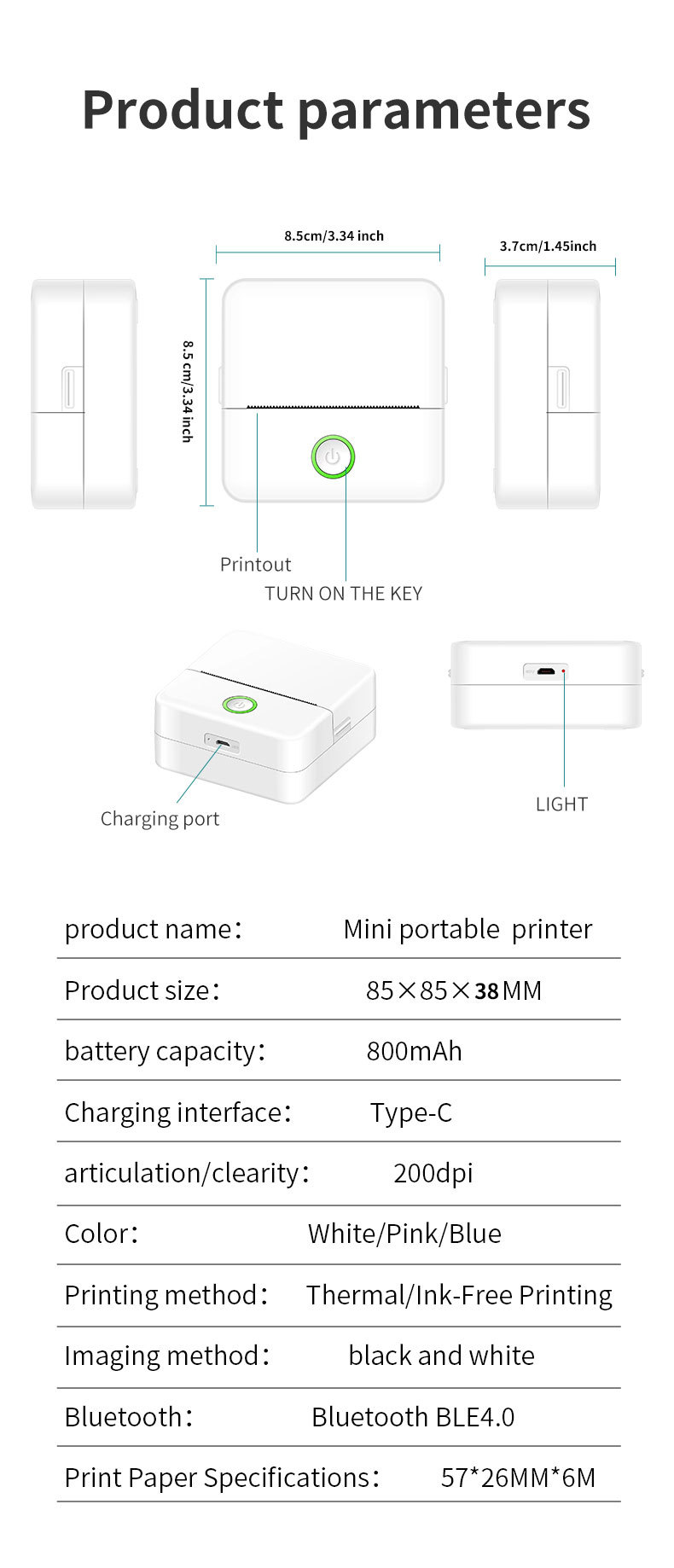packing List: PRINTER * 1 + printing paper * 1 + instruction * 1 + charging cable * 1