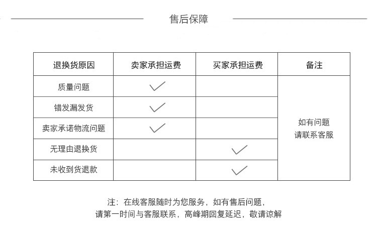 If there are any shortages or quality issues with the goods after receipt, please contact the after-sales customer service within three days. For goods with quality issues, please take pictures of the goods upon receipt and send them to the customer service.