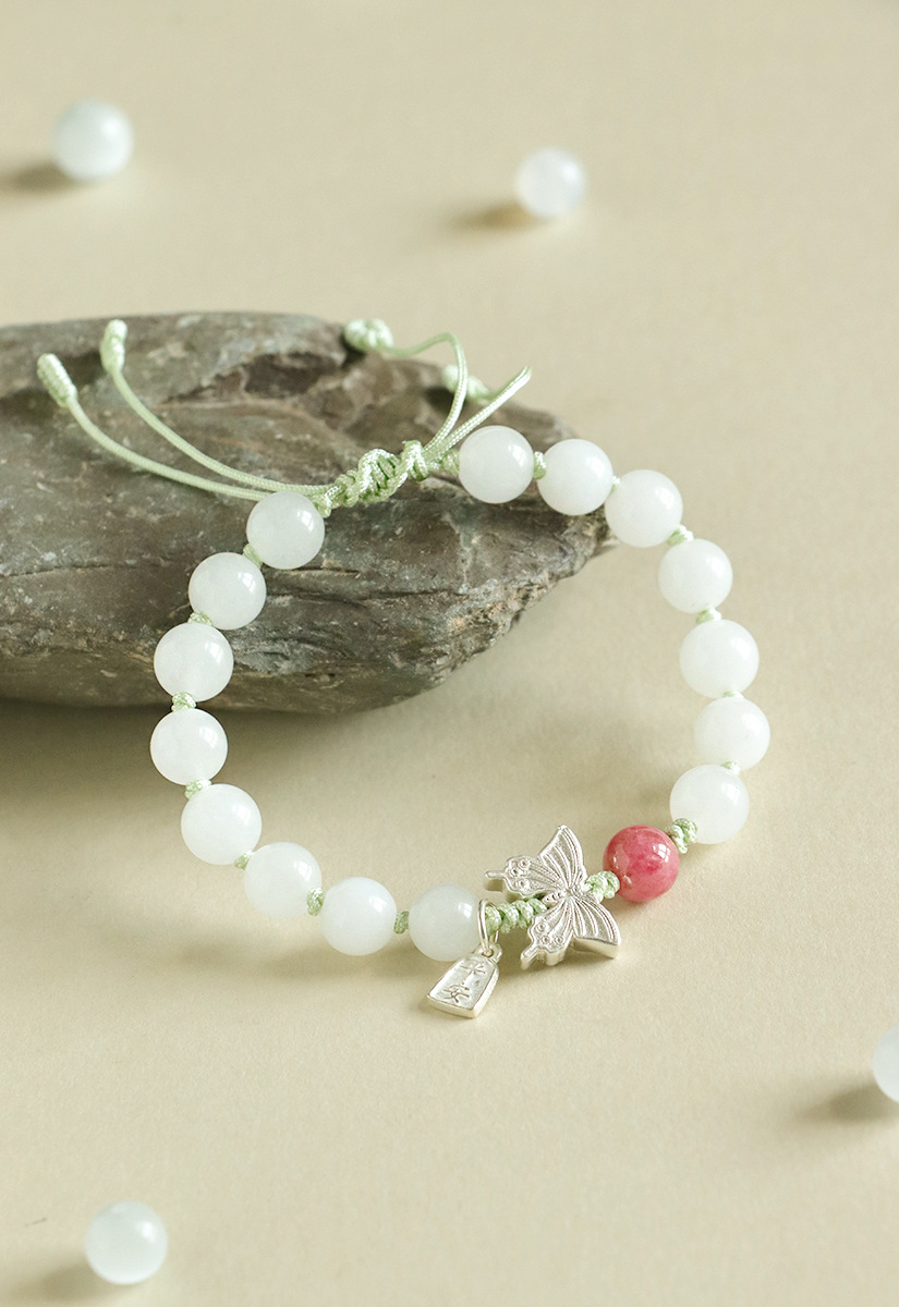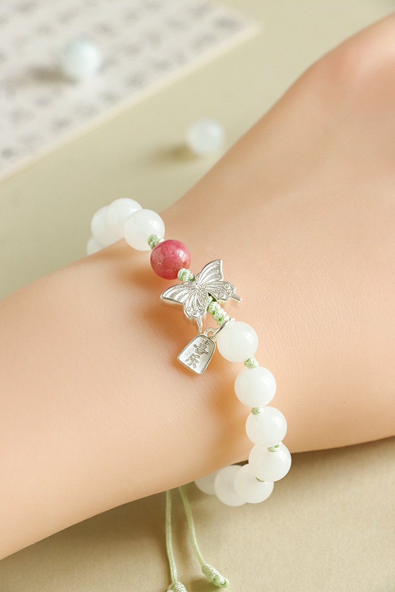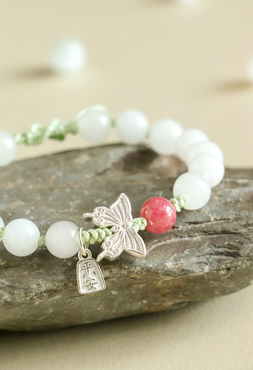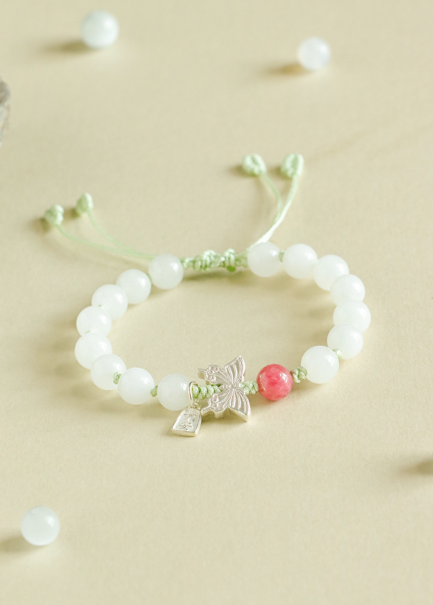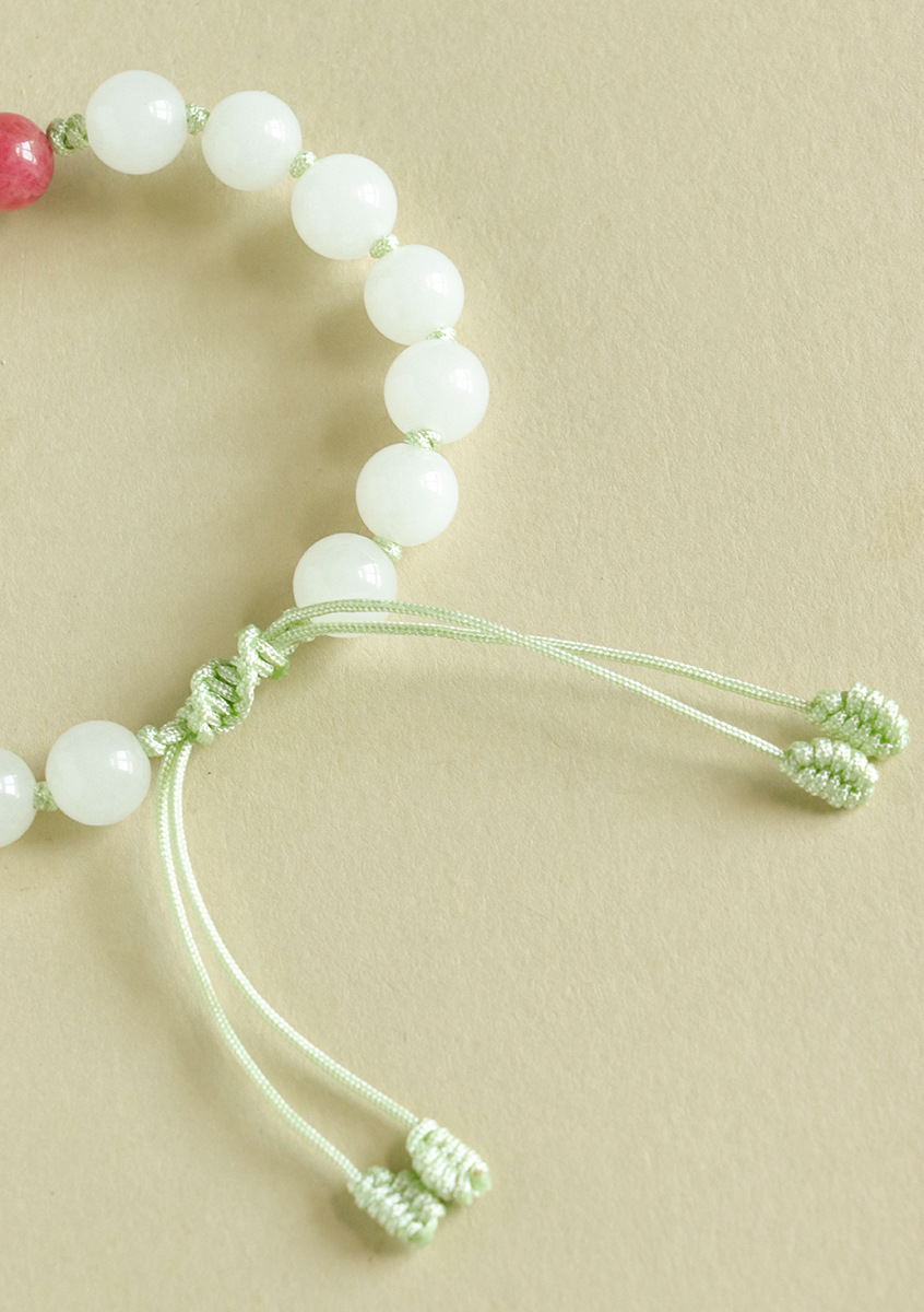 white jade + rose stone 925 silver flat anpai pith bracelet