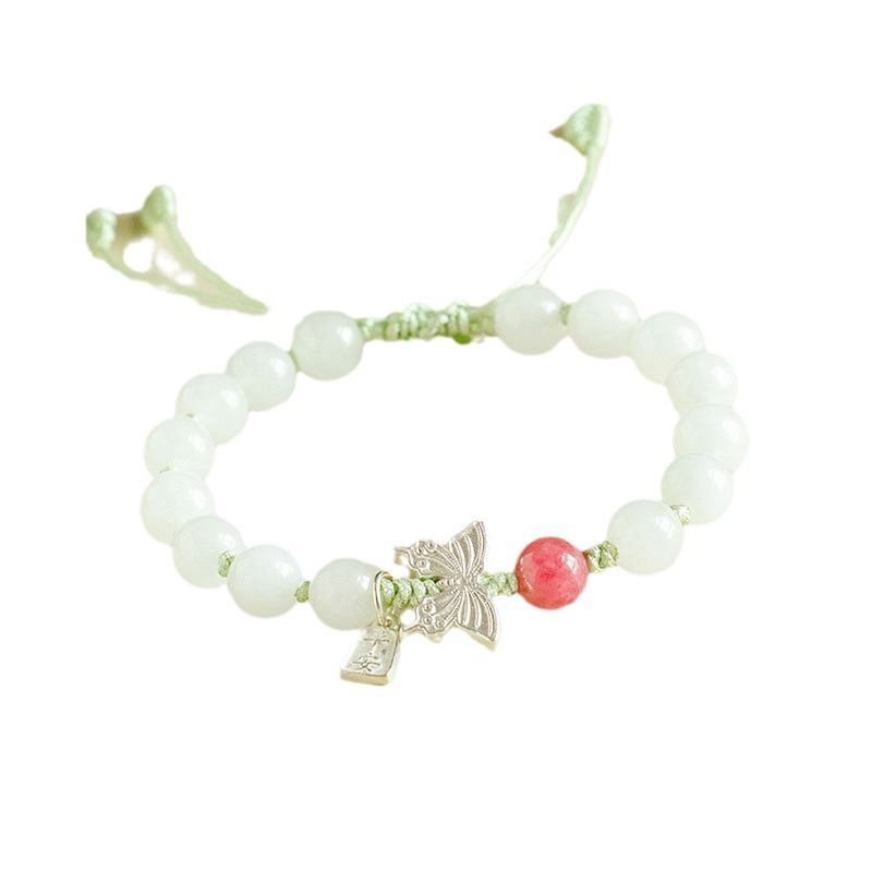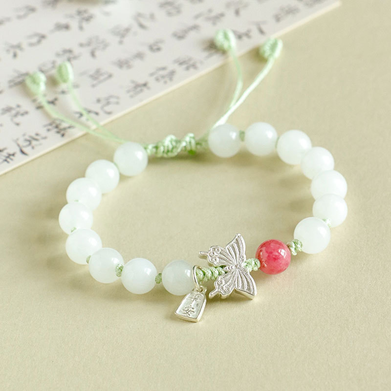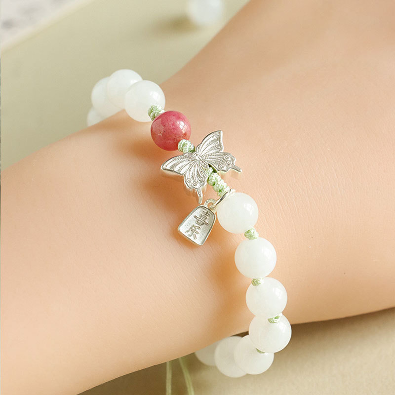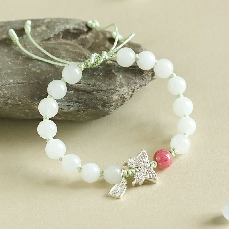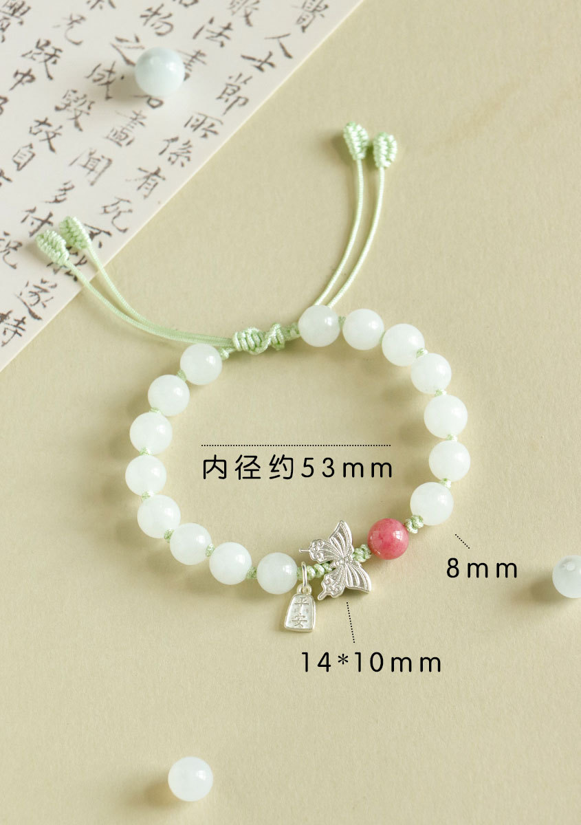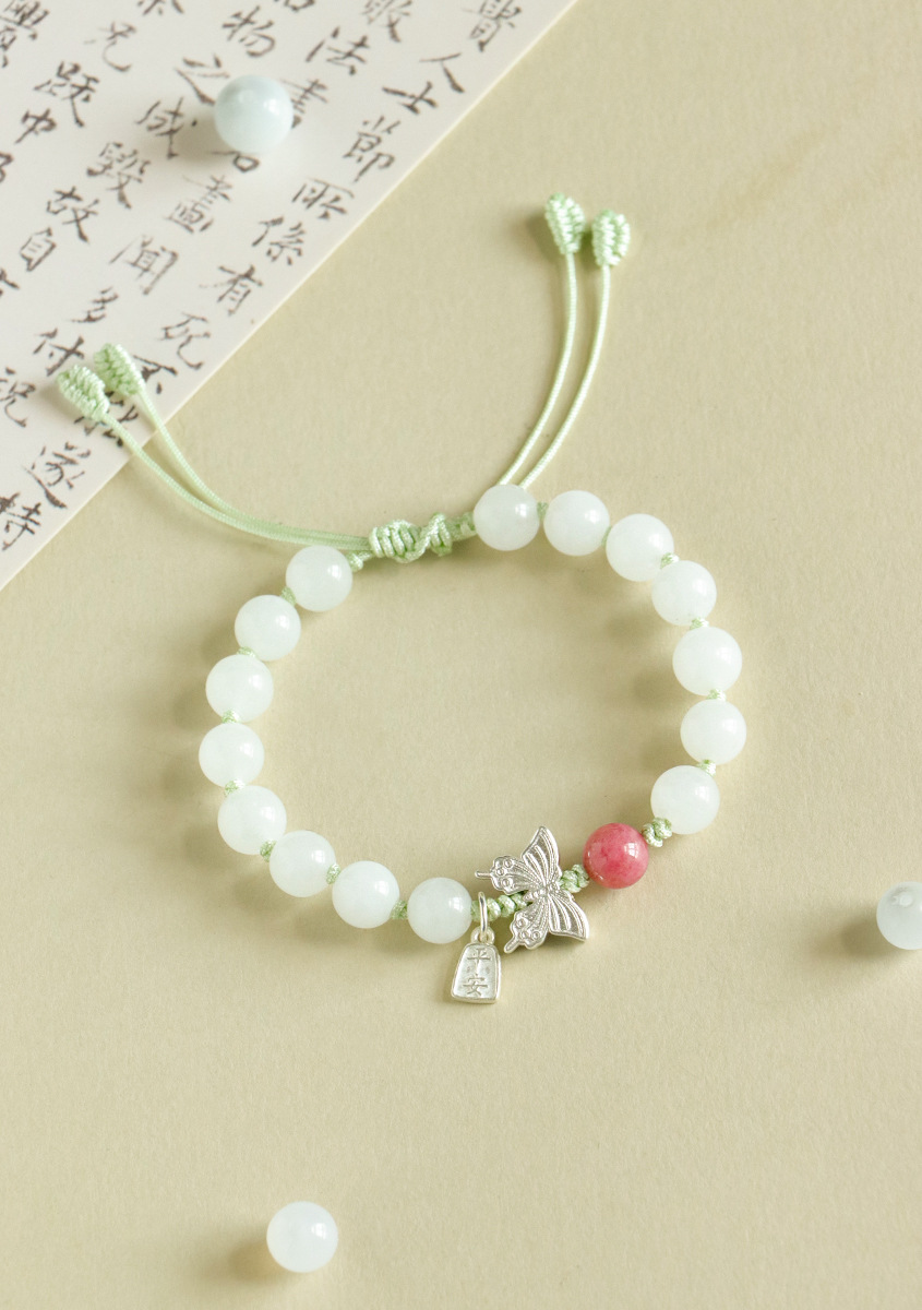 white jade + rose stone 925 silver flat anpai pith bracelet