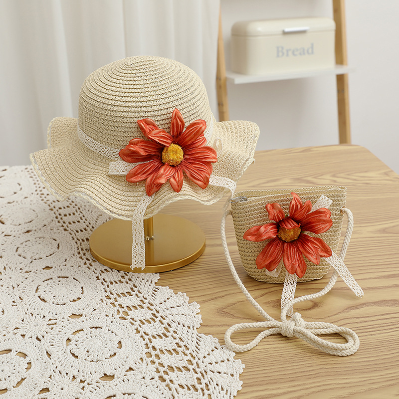 Sweet little girl's large flower sun hat with matching bag