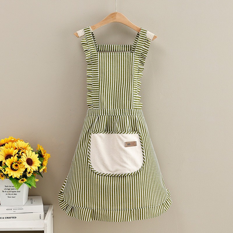 strap cotton and linen stripes hand-wiping pocket princess dress [green