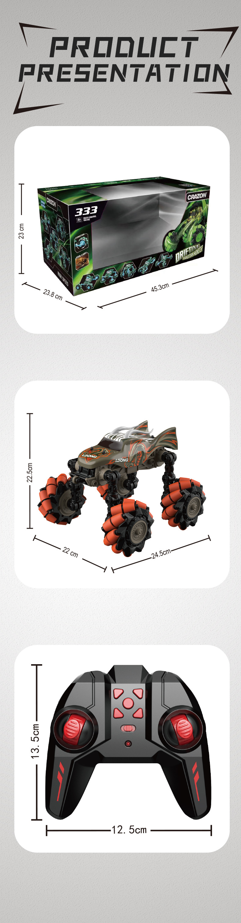 Features: Forward and backward, left and right turns, one-button drift, side drift, drift forward, 360-degree rotation. Wheels can be folded at multiple angles to achieve various shapes. Comes with cool lights.