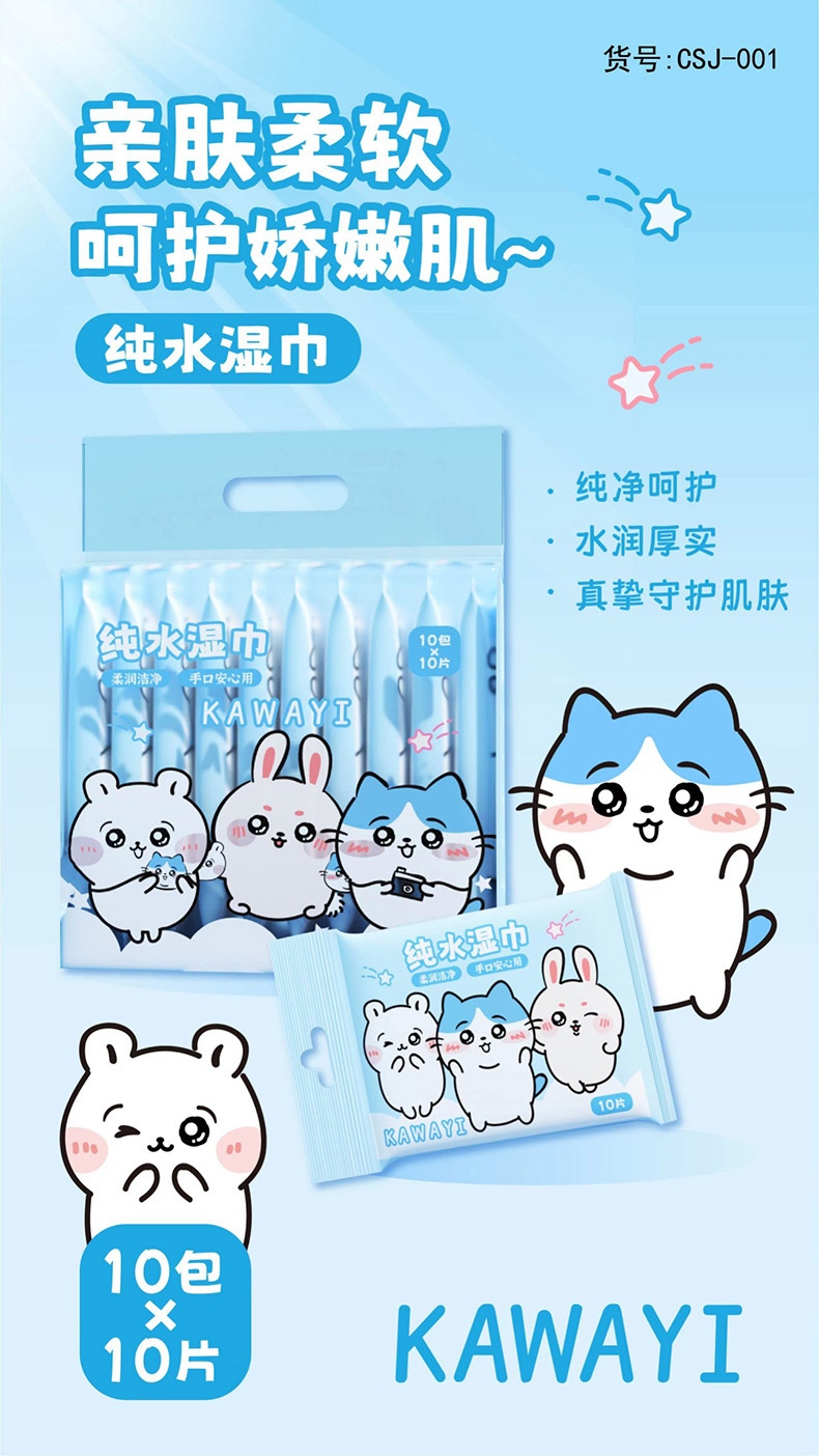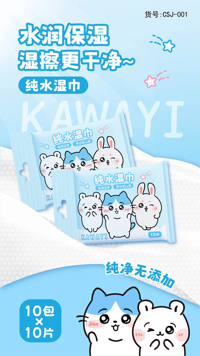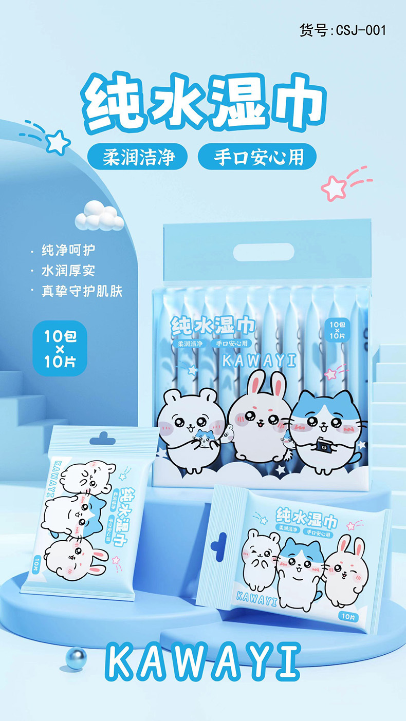 (10 pieces * 10 packs) kawayi pure water wet wipe (blue)
