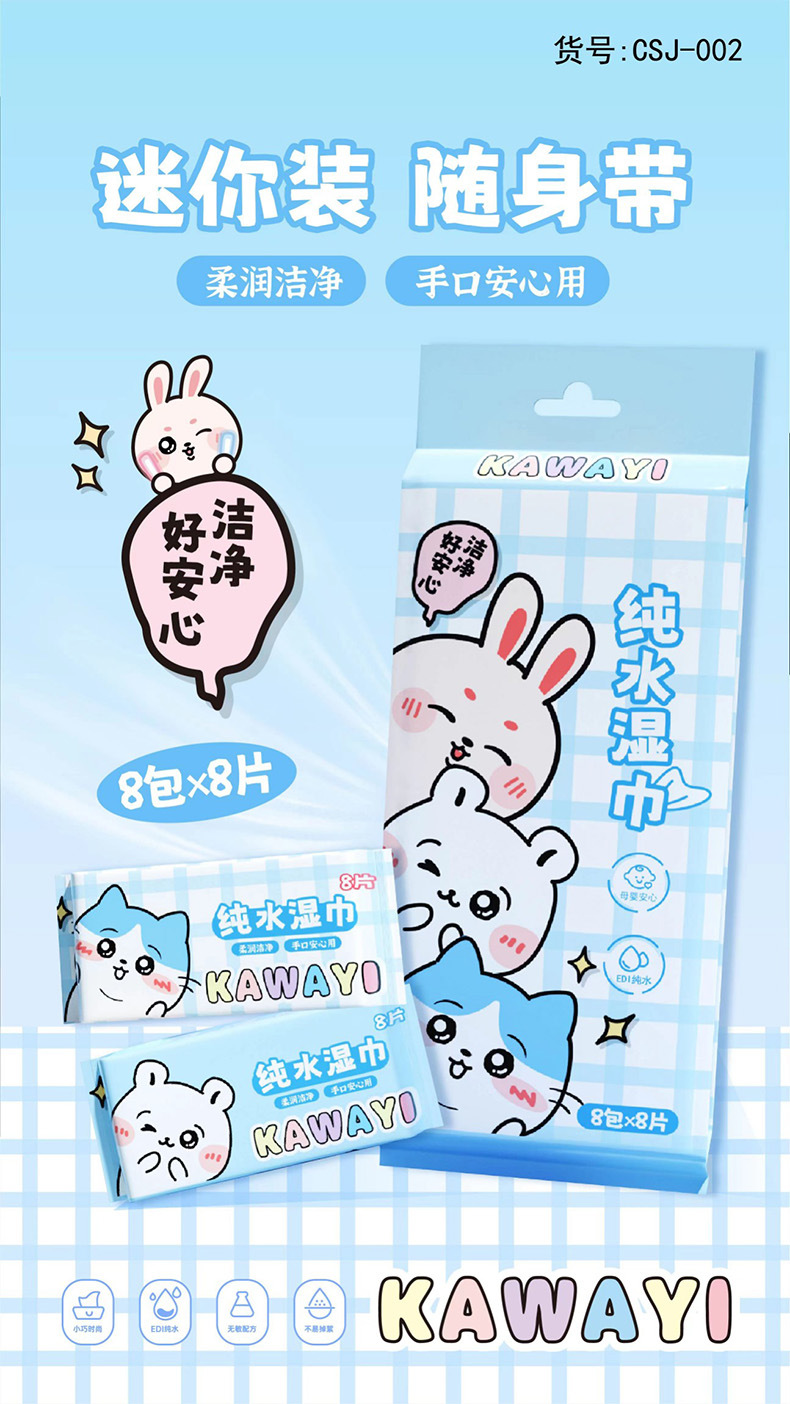 (8 pieces * 8 packs) kawayi pure water wet wipe mini pack (blue)