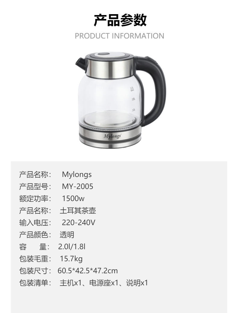 Export Middle East Russia New Model Mylongs Large Quantity Stock MY-2005 High Boric Silica Glass Kettle Electric Kettle
