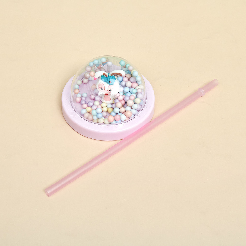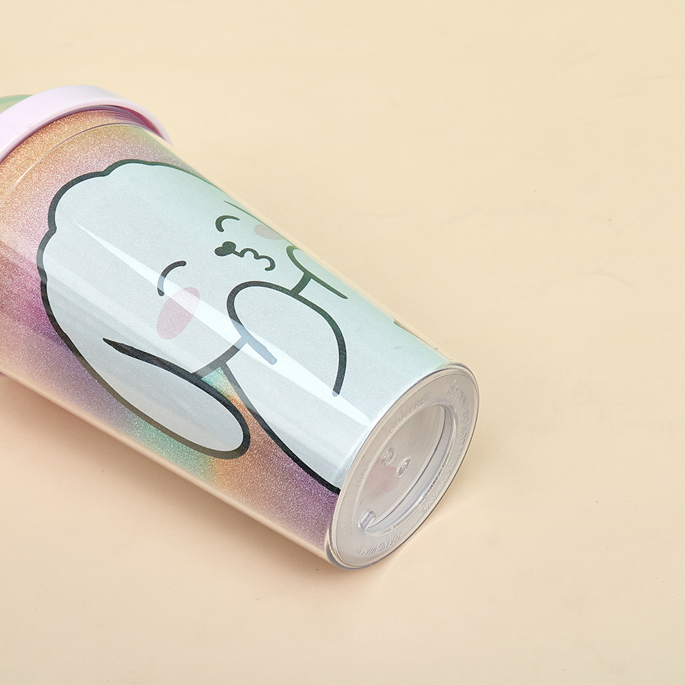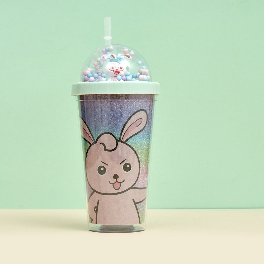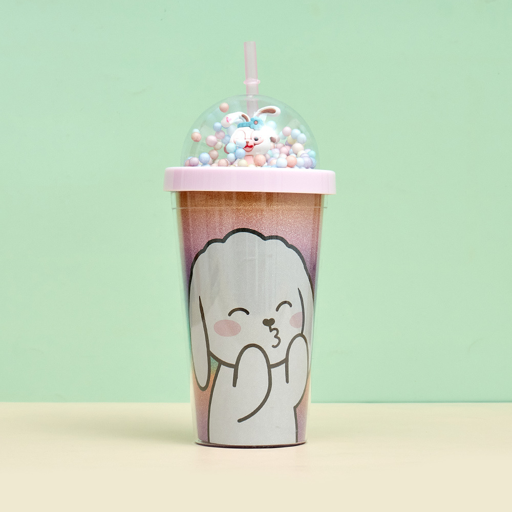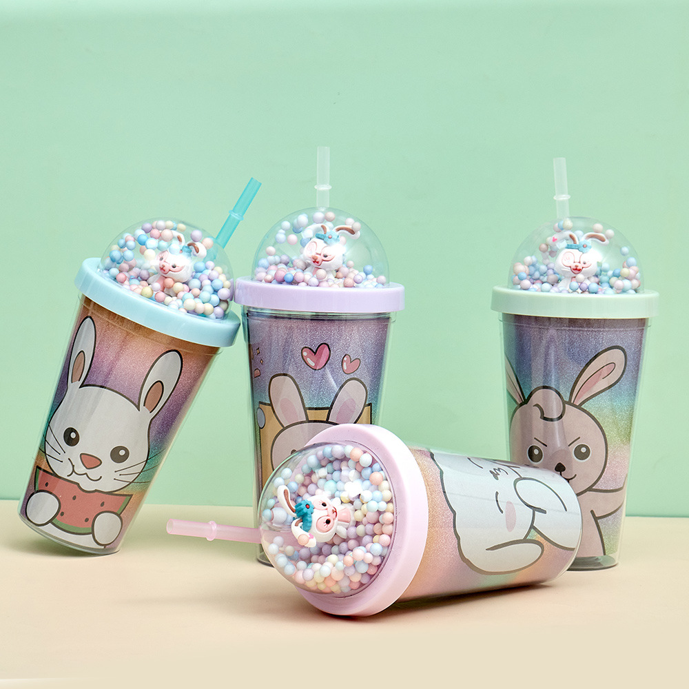 good-looking simple straw plastic water cup ins children's large capacity water cup cartoon rabbit round lid portable water cup