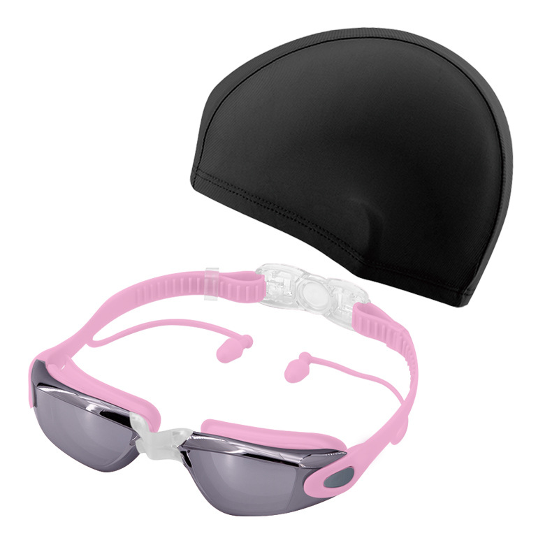 electroplated pink-swimming goggles + cloth swim cap (black cap)