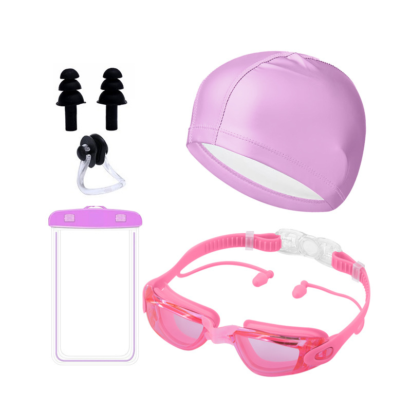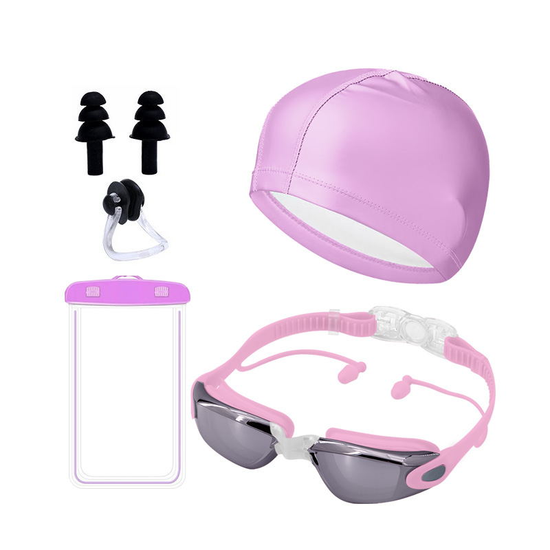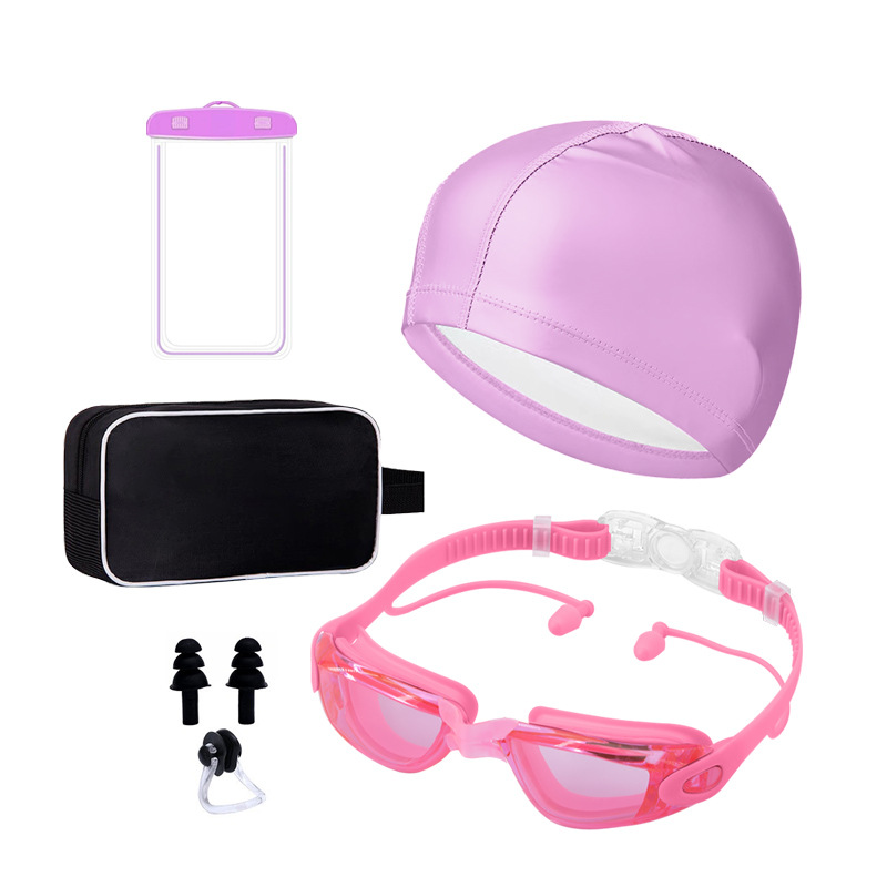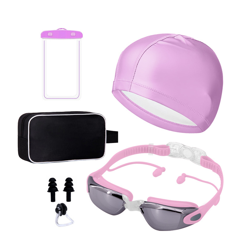 electroplated pink-goggles + pu cap + nasal splint earplugs + waterproof bag + swimming bag