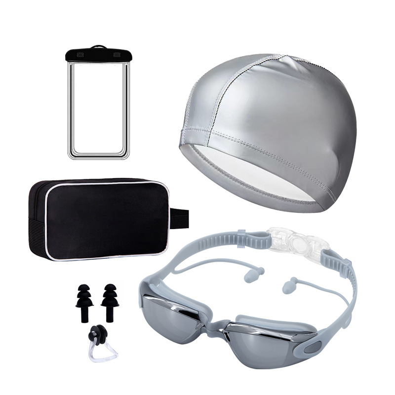 electroplating silver-goggles + pu cap + nasal splint earplugs + waterproof bag + swimming bag