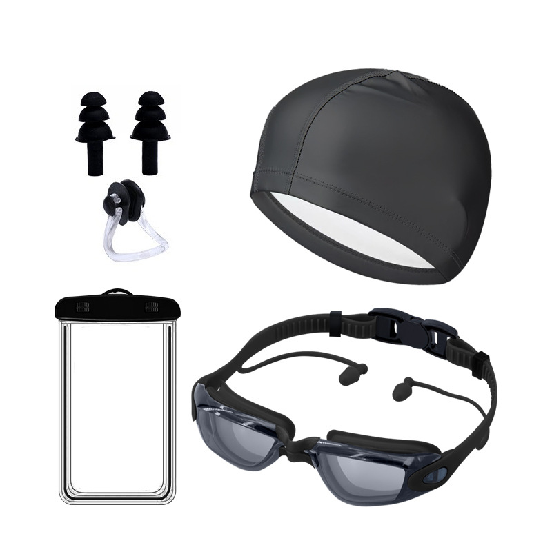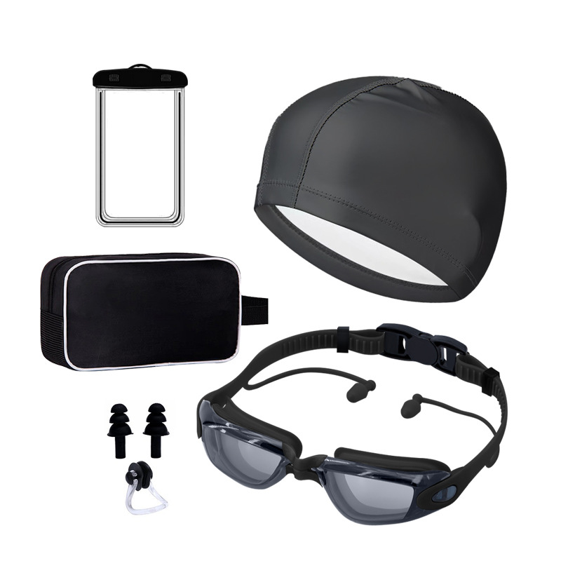 electroplated black-goggles + pu cap + nasal splint earplugs + waterproof bag + swimming bag