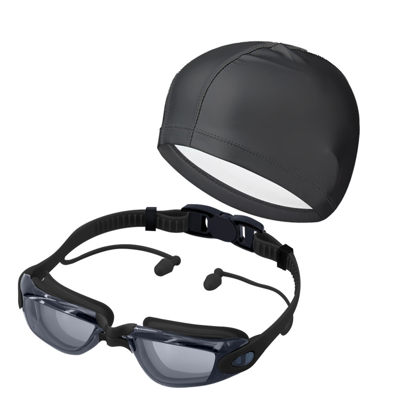 electroplated black-swimming goggles + pu waterproof swimming cap (swimming standard)
