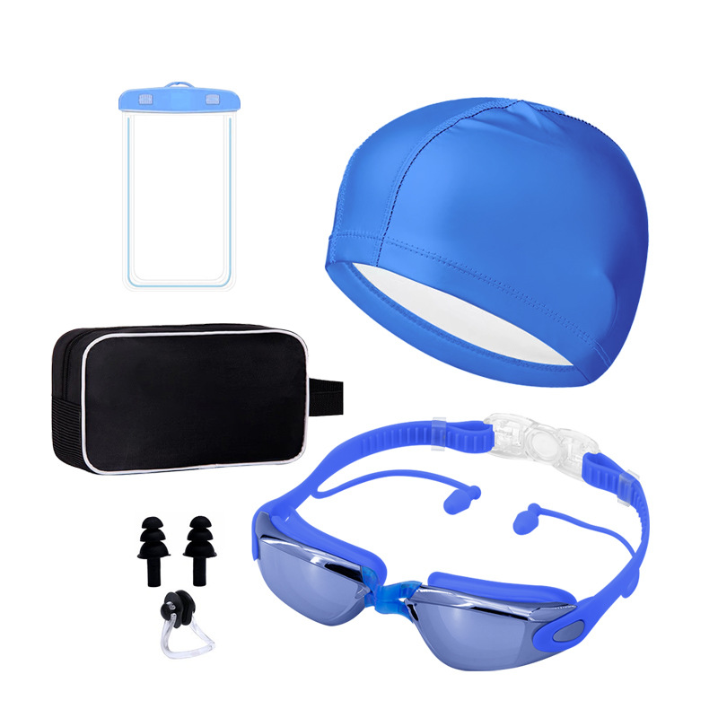 blue plating + pu swimming cap + nasal splint earplugs + mobile phone waterproof bag + swimming bag