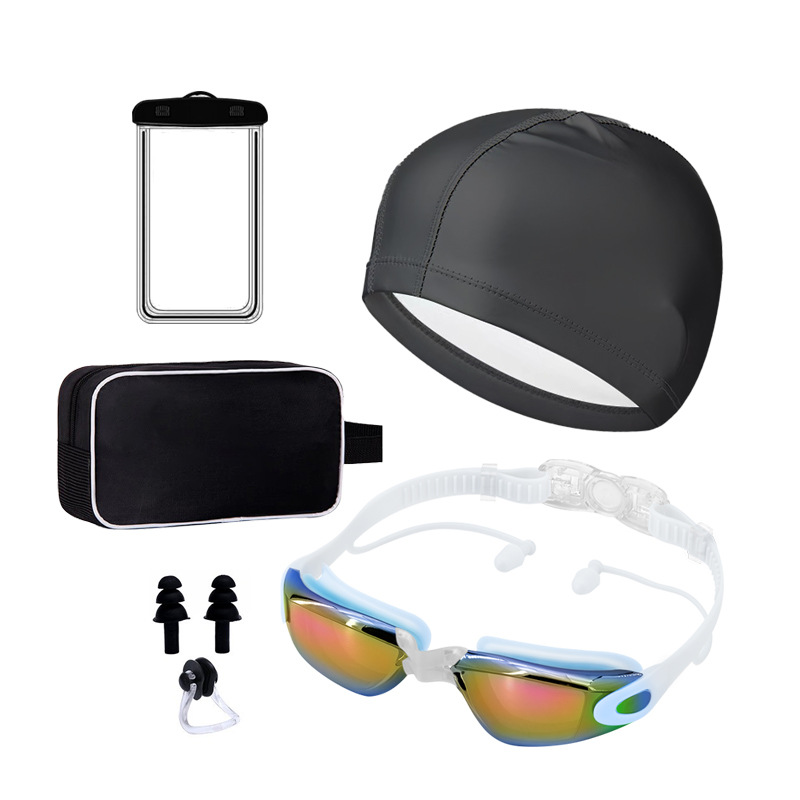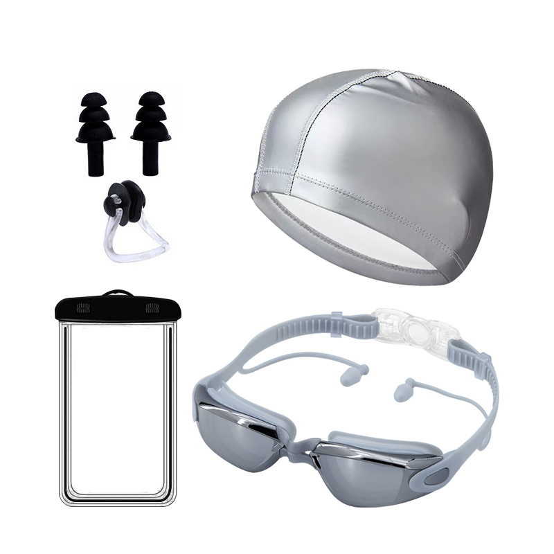 silver electroplating + pu swimming cap + nasal splint earplugs + mobile phone waterproof bag + swimming bag