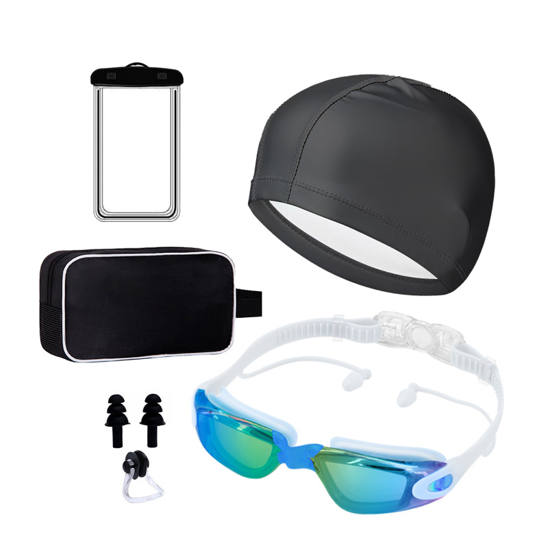 black plating + pu swimming cap + nasal splint earplugs + mobile phone waterproof bag + swimming bag