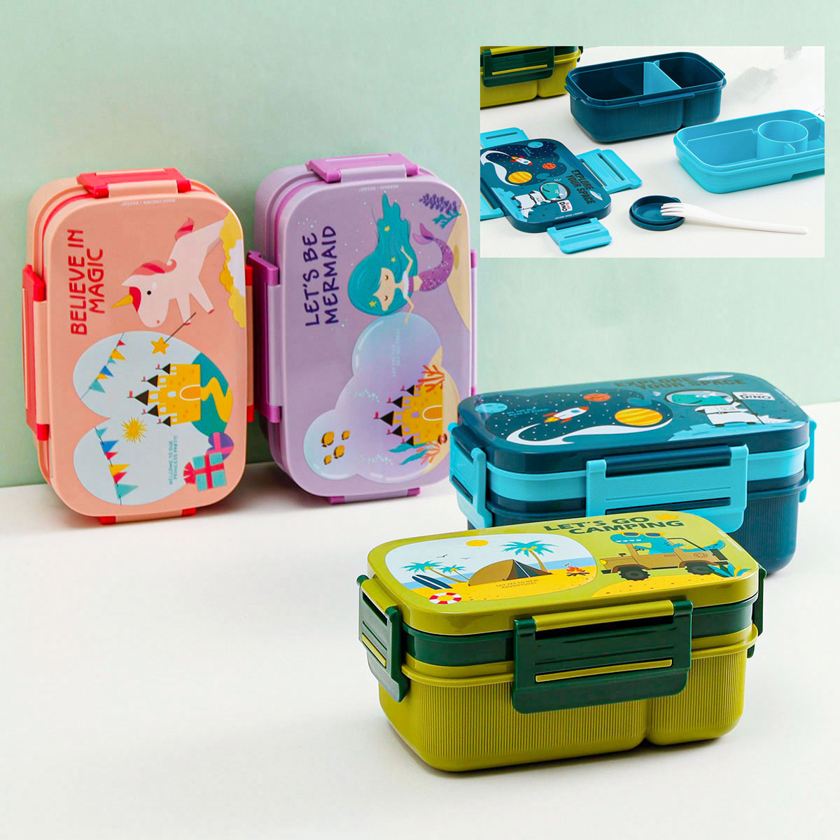 cartoon large capacity lunch box water cup suit portable double-layer sealed bento box 1.8l/1.3l + 500ml cup