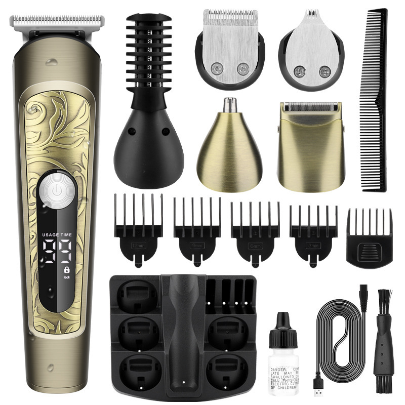 附件:理发刀、修鬓刀、鼻毛修剪器、剃须刀、刻字刀、体毛刀、收纳盒、清洁刷、油瓶、USB充电线、限位梳(3,6,9,12MM)