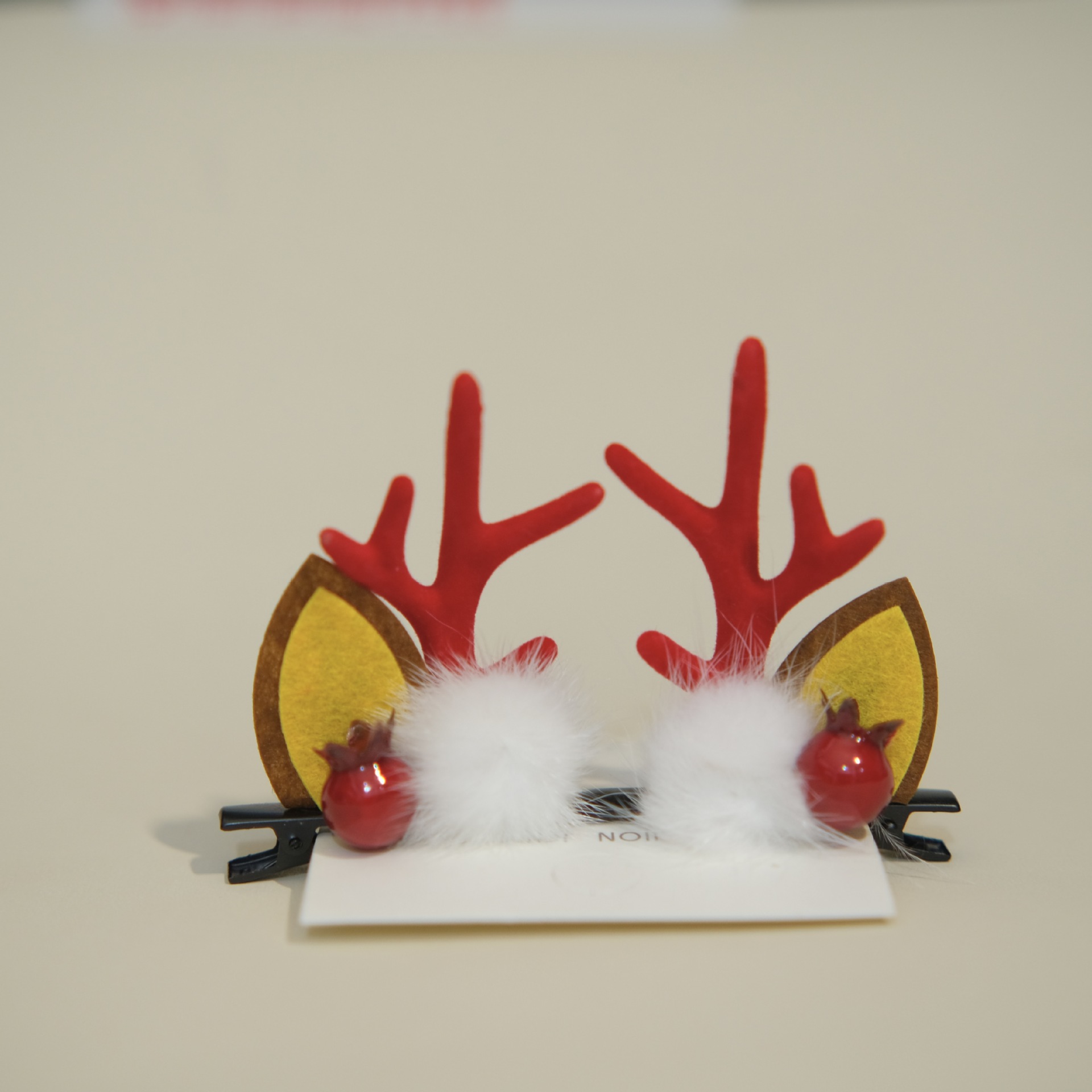 a pair of white fur balls and red corners