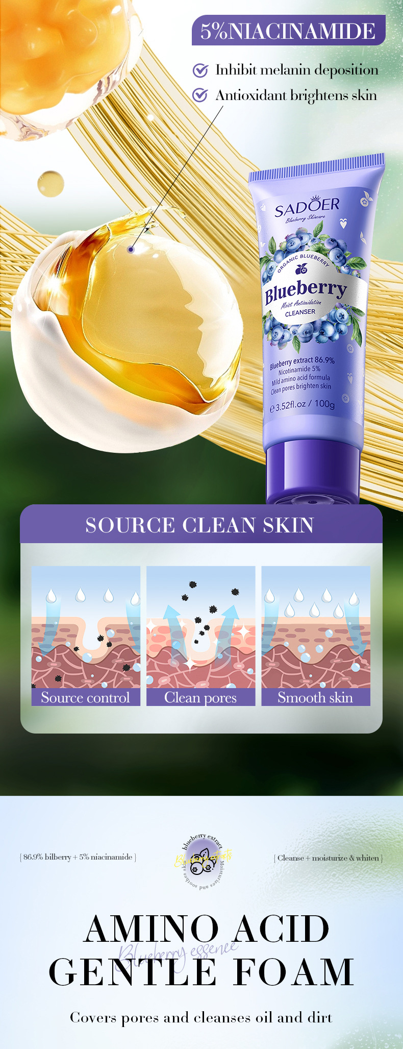 English Hyaluronic Acid Series Sadoer Amino Acid Facial Cleanser Cross-Border Foreign Trade Factory Direct Sales