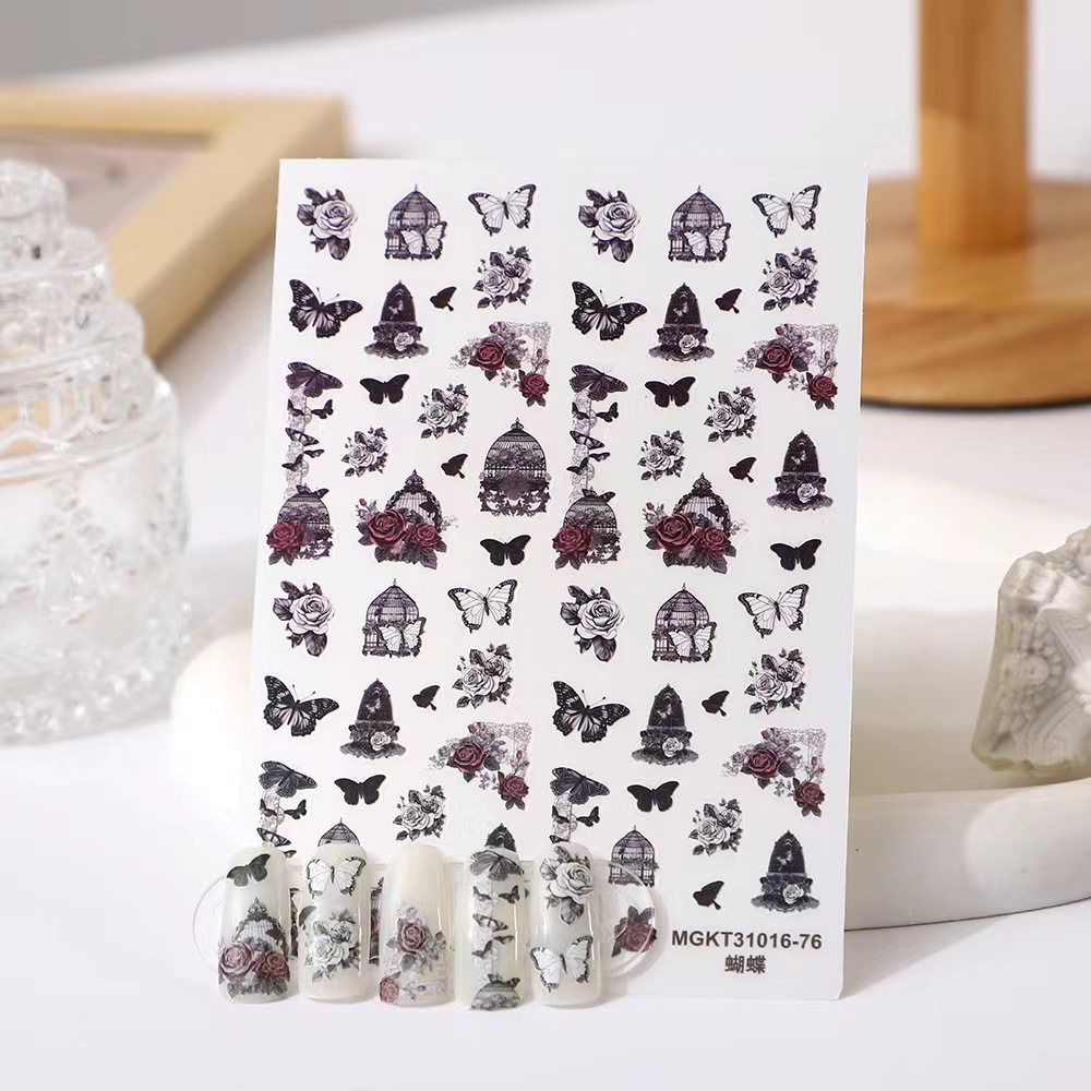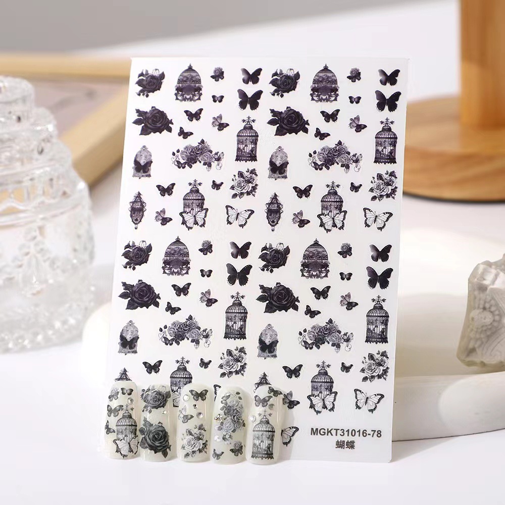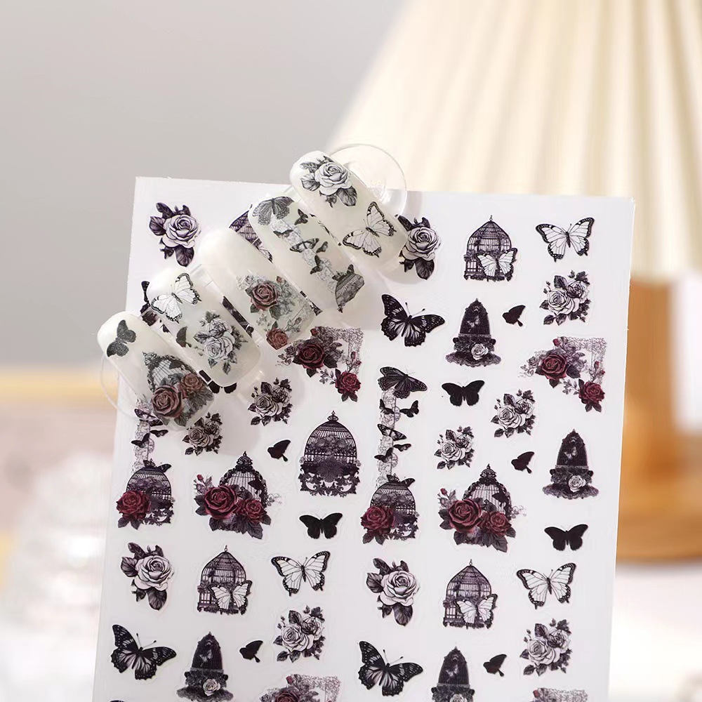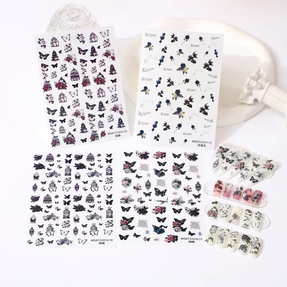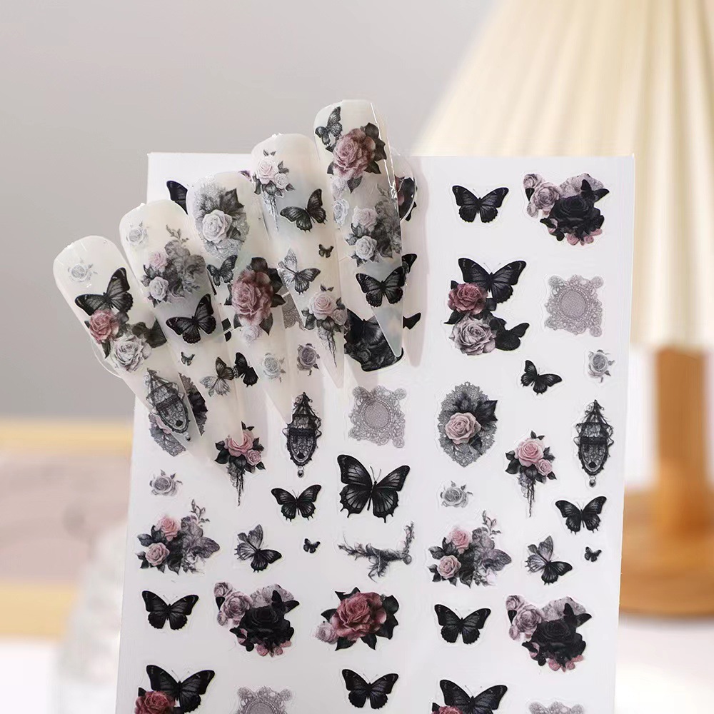 rose nail art three-dimensional relief dark butterfly illustration nail stickers paper rose bohemian butterfly flame spider