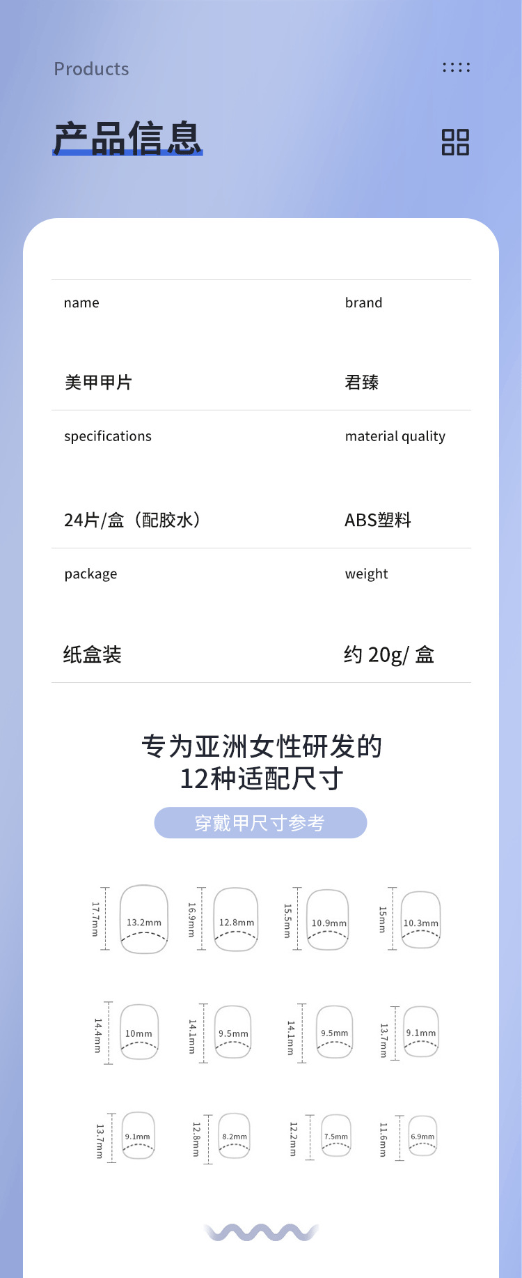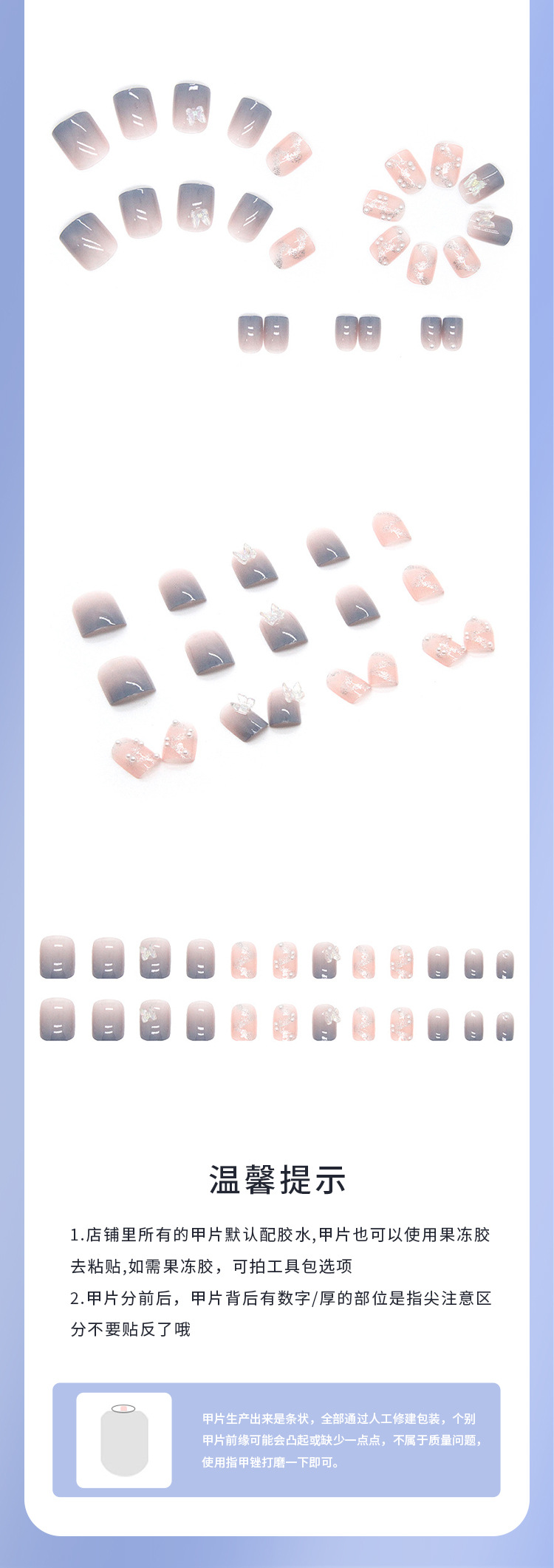 | 24 pieces boxed + tool kit (jelly glue + nail rub + alcohol pad + nail removal stick) | CN¥ 7.66 | 2169 set available |
