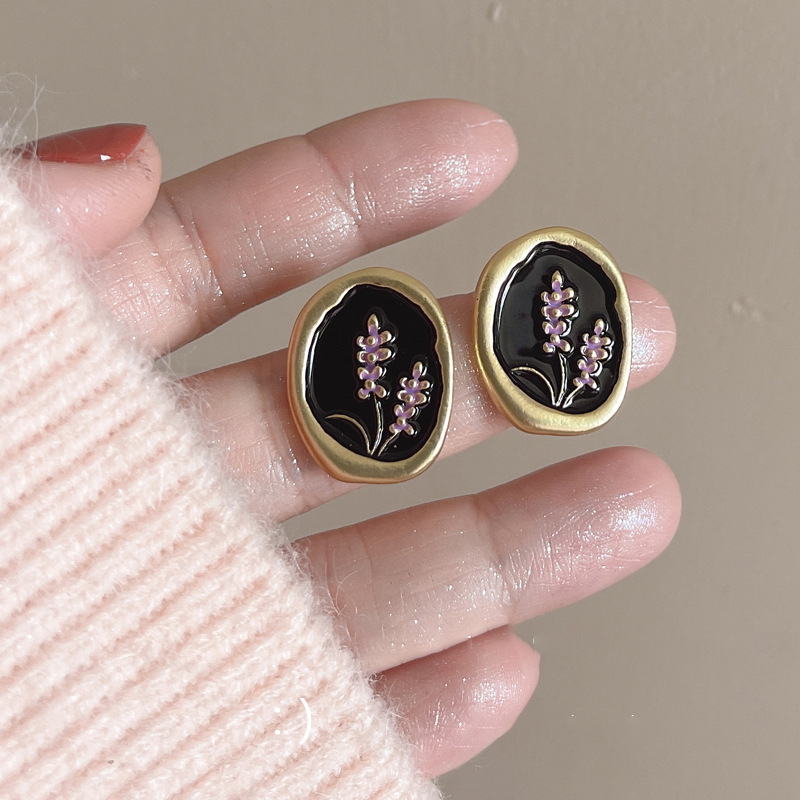#9 [irregular oval purple flower stud earrings with golden bottom]]