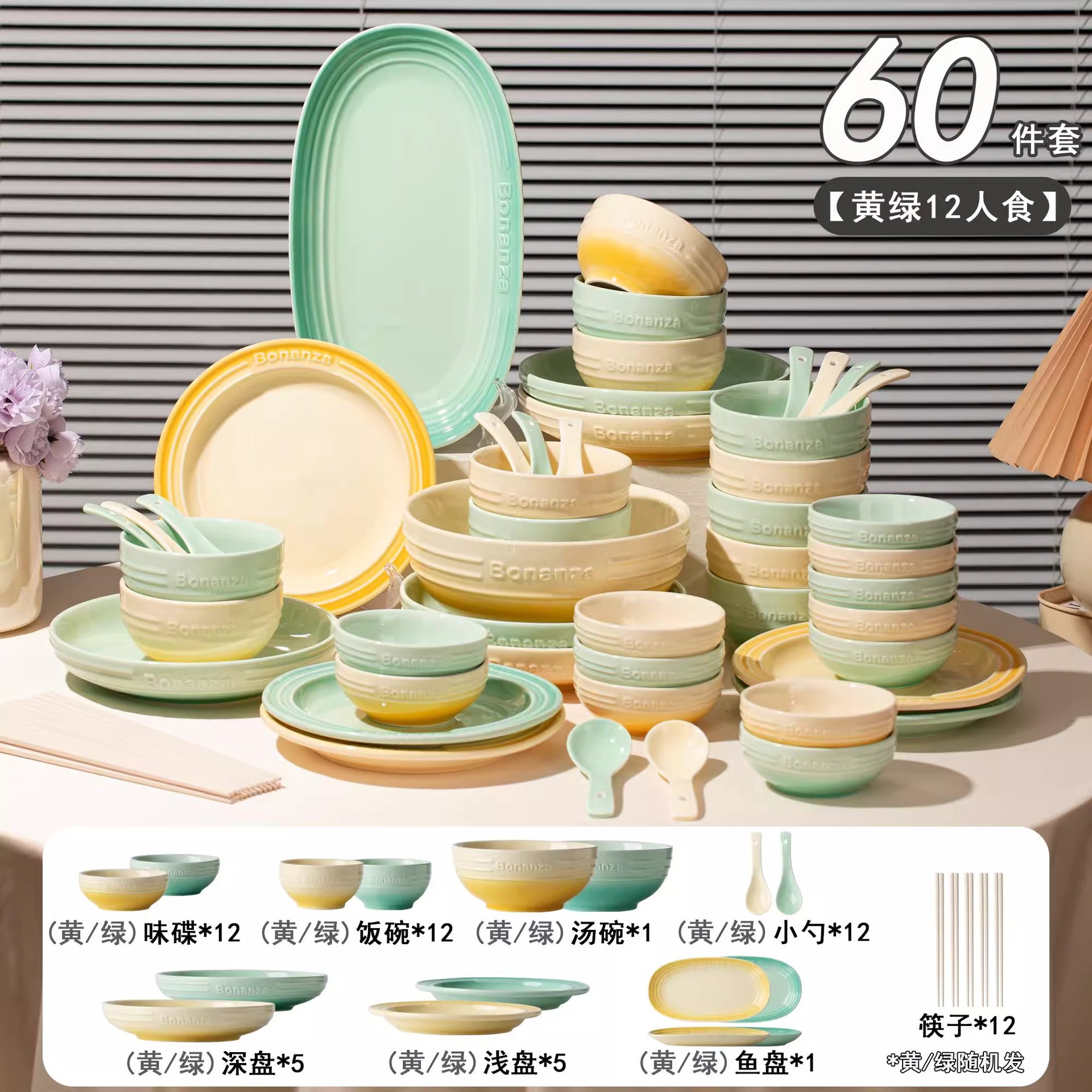 peacock green goose down yellow-mix-12-person food 60-piece set