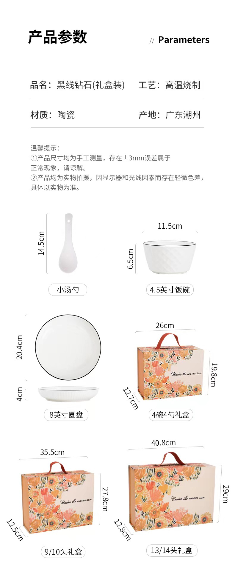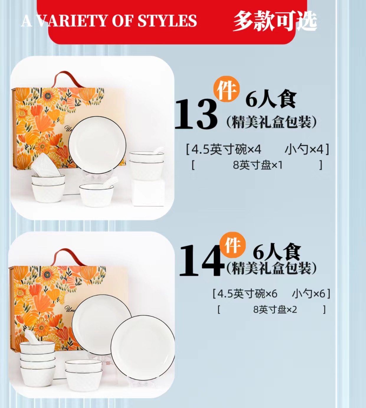 14 heads (6 bowls, 6 spoons, 2 plates) 10 sets per box