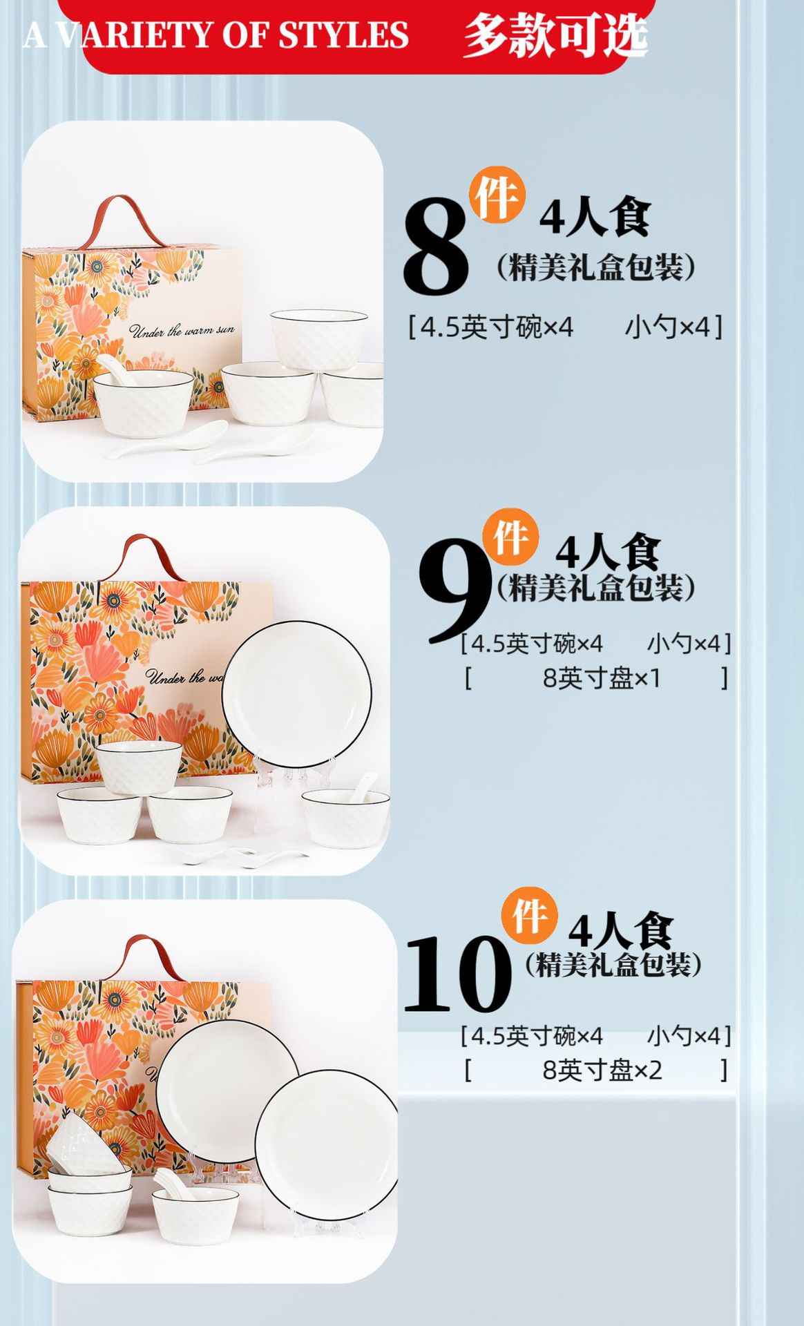 10 pieces (4 bowls, 4 spoons, 2 plates) 10 sets per box