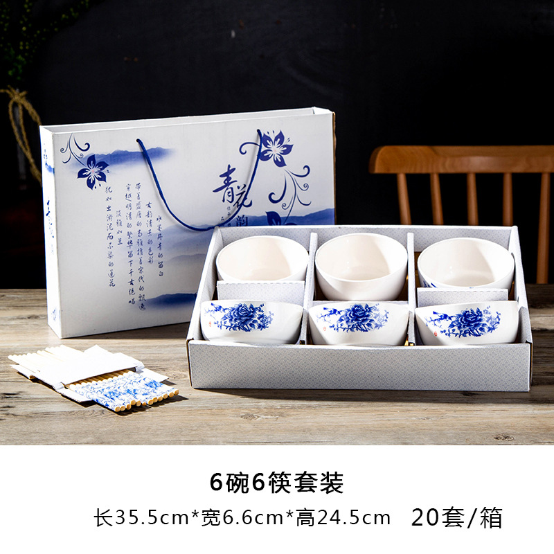 blue and white 6 bowls 6 chopsticks 20 sets
