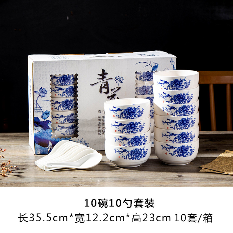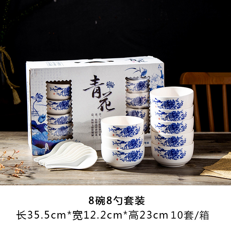 blue and white 6 bowls 6 spoons 1 plate 10 sets/box