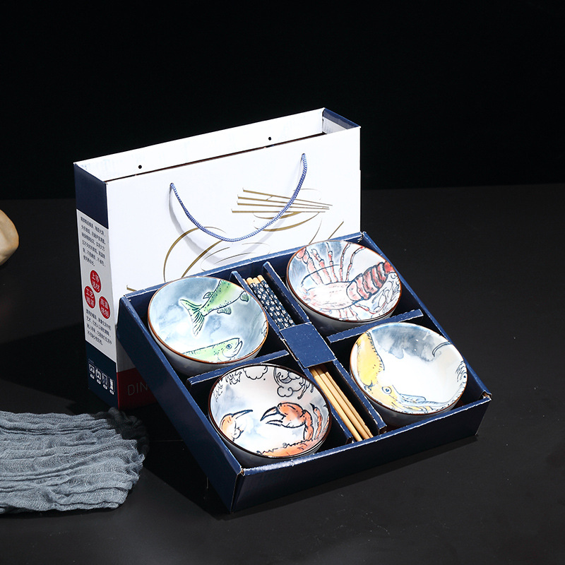 fish shrimp crab 4 bowls 4 chopsticks pattern random 24 sets/box