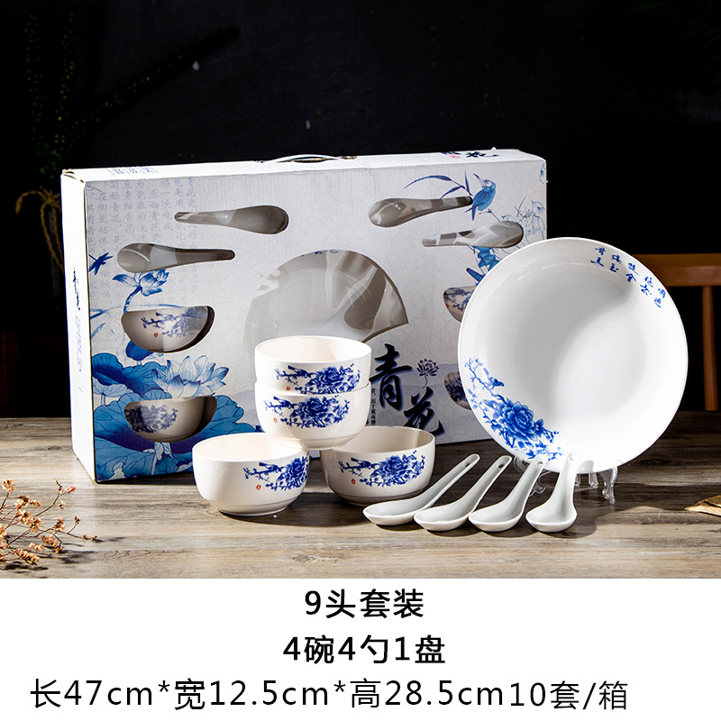 blue and white 4 bowls 4 spoons 1 plate 10 sets/box