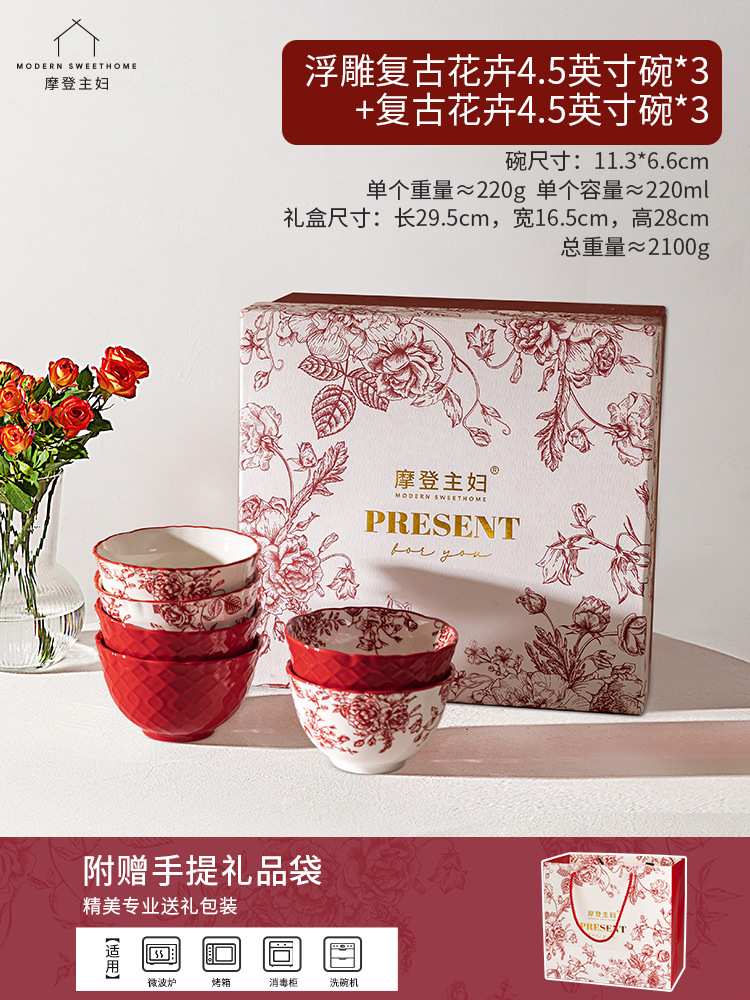 [gift box-6 mixed color bowls] embossed flowers 4.5 inch bowl * 3 + vintage flowers 4.