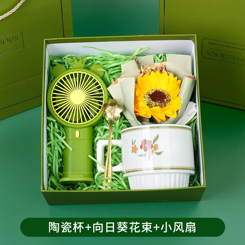 ceramic cup + sunflower bouquet + little fan