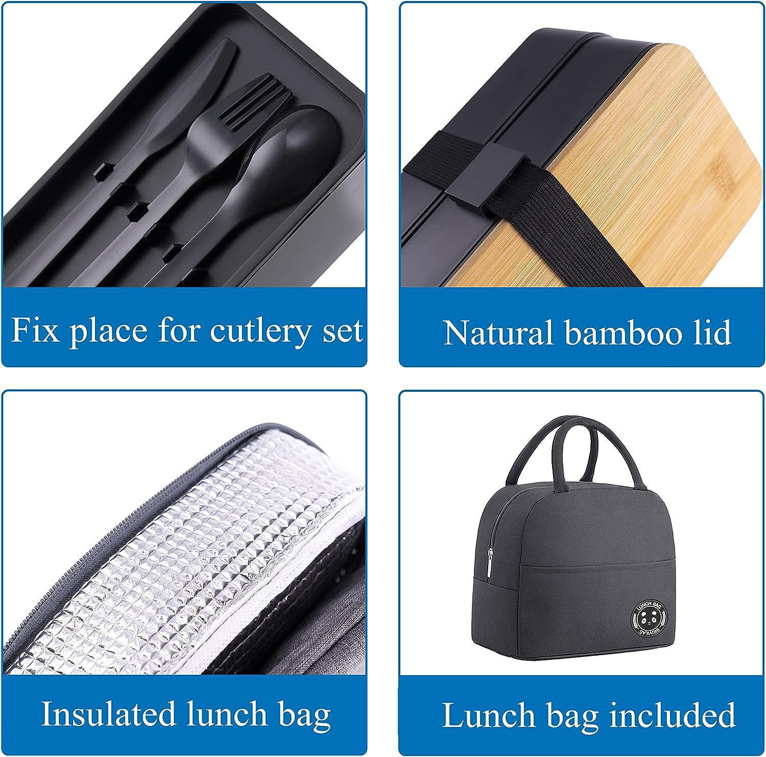 double-layer bamboo cover lunch box-black (including thermal bag)