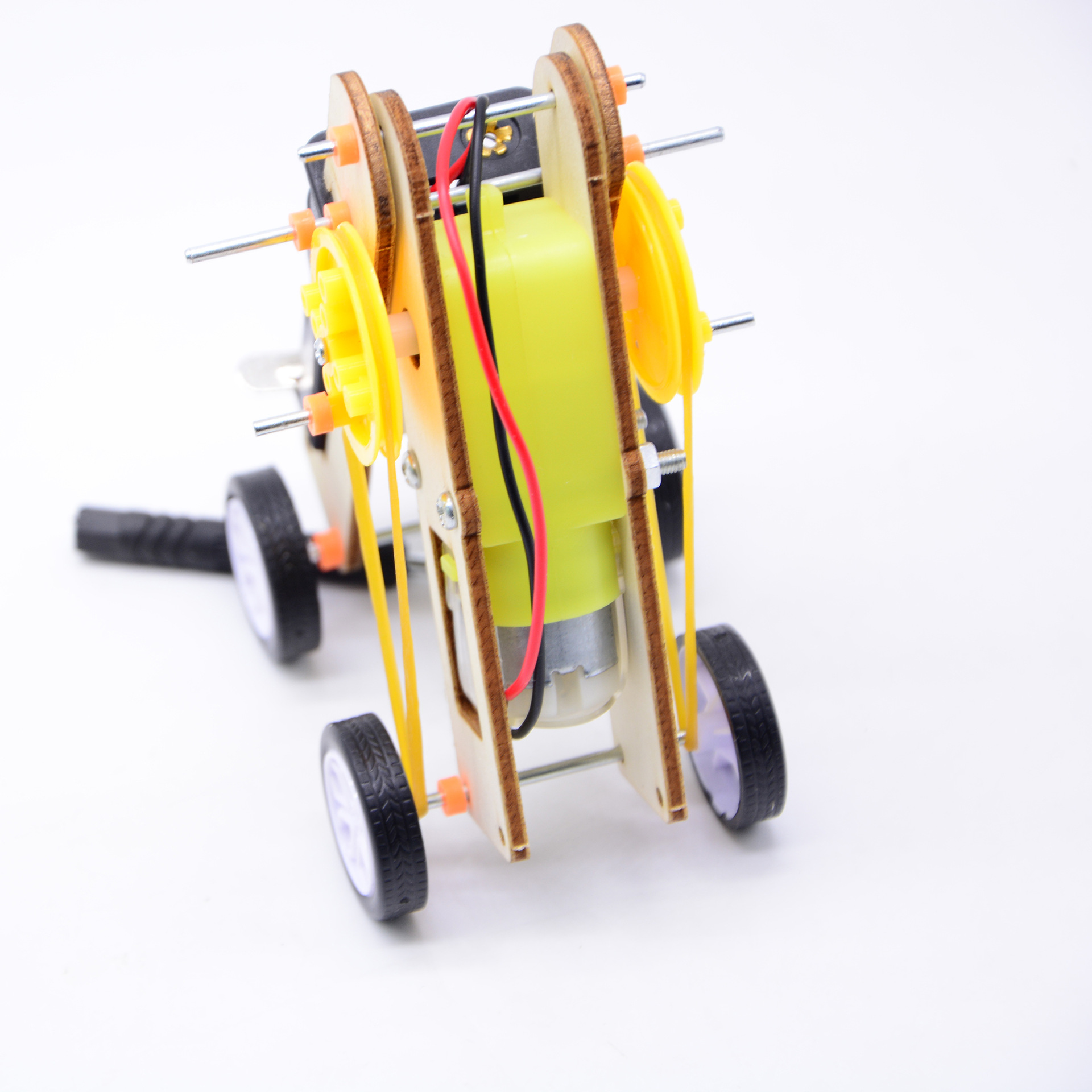 The yellow wheel rotates. A crankshaft-linkage structure composed of the motor, yellow wheel, connecting rod, and support allows the worm robot's body to perform regular stretching and contracting movements under the drive of the motor. By restricting the rubber bands and driving the worm robot, it can stretch and advance in one direction.