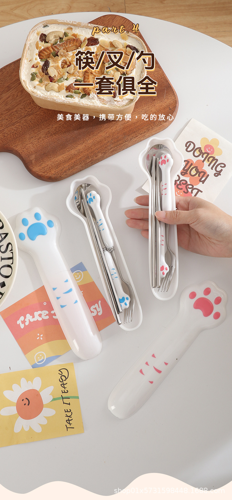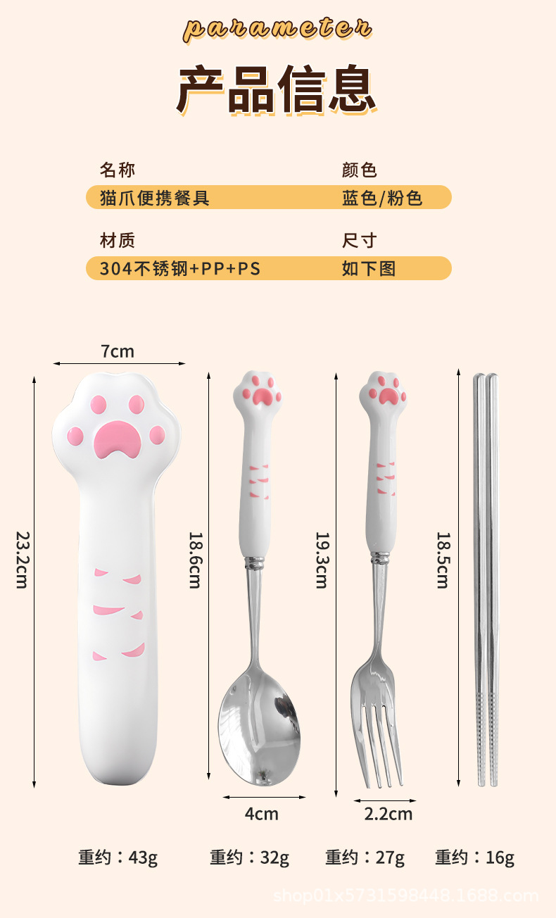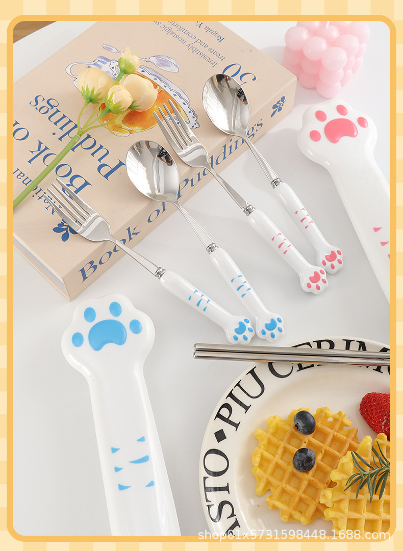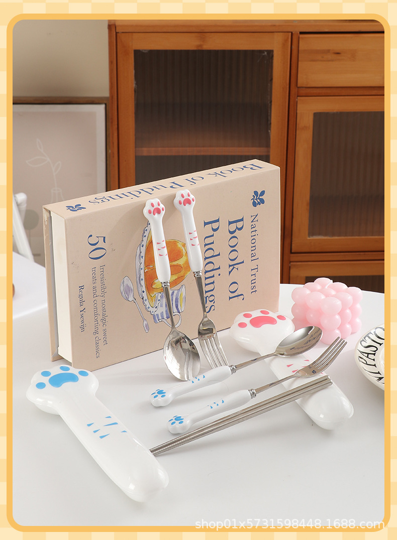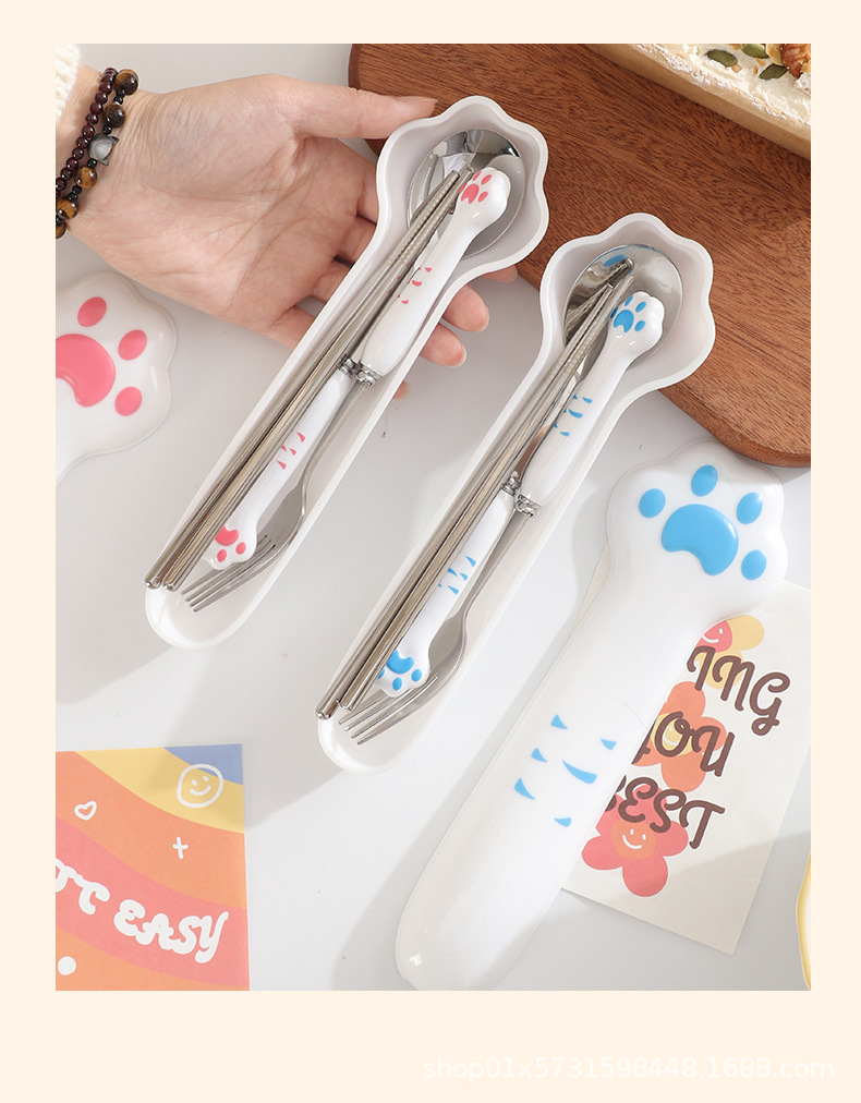 410 white handle blue claw spoon + fork + chopsticks + box