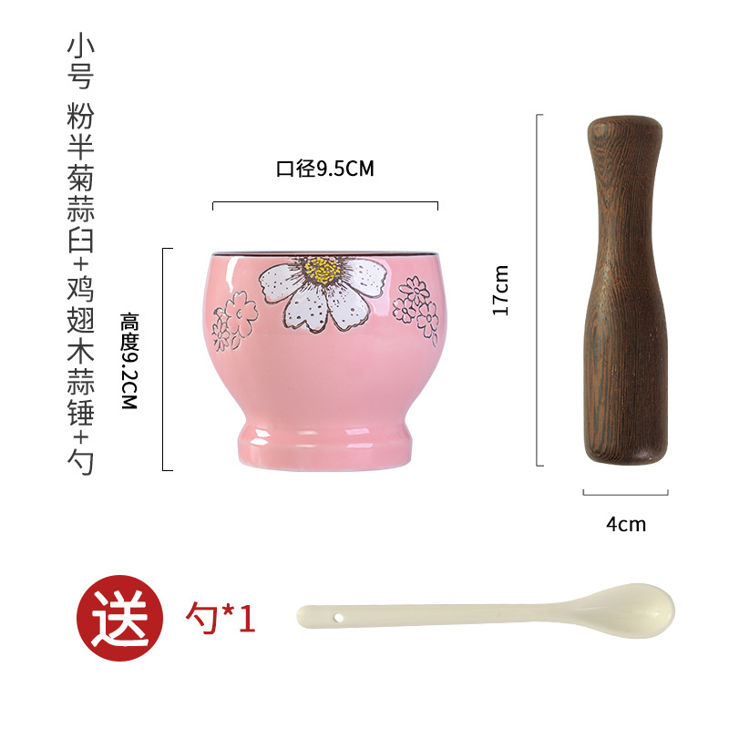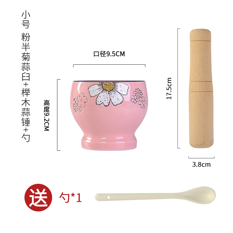 small size pink half chrysanthemum garlic mortar + door frame garlic hammer get ceramic spoon free