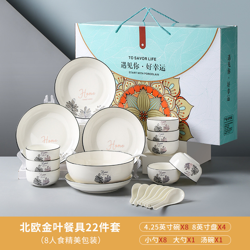 22 pieces, 8 bowls, 8 spoons, 4 plates, 1 soup bowl, a large spoon (5 sets, 1 box)