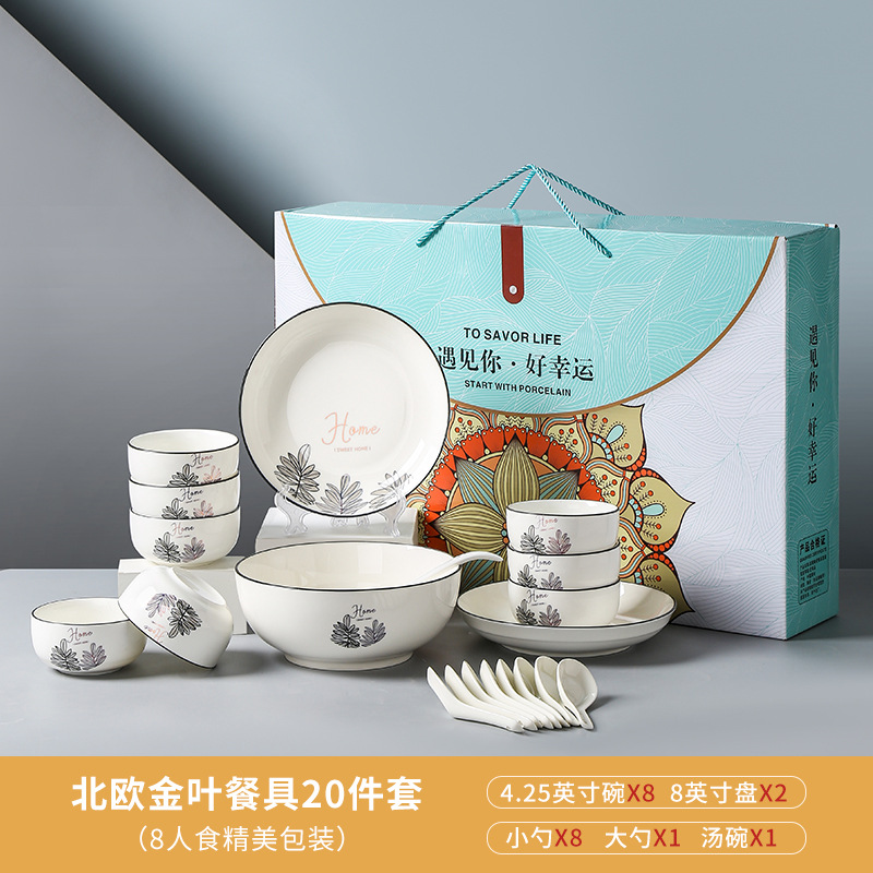 20 pieces, 8 bowls, 8 spoons, 2 plates, 1 soup bowl, a large spoon (5 sets, 1 box)