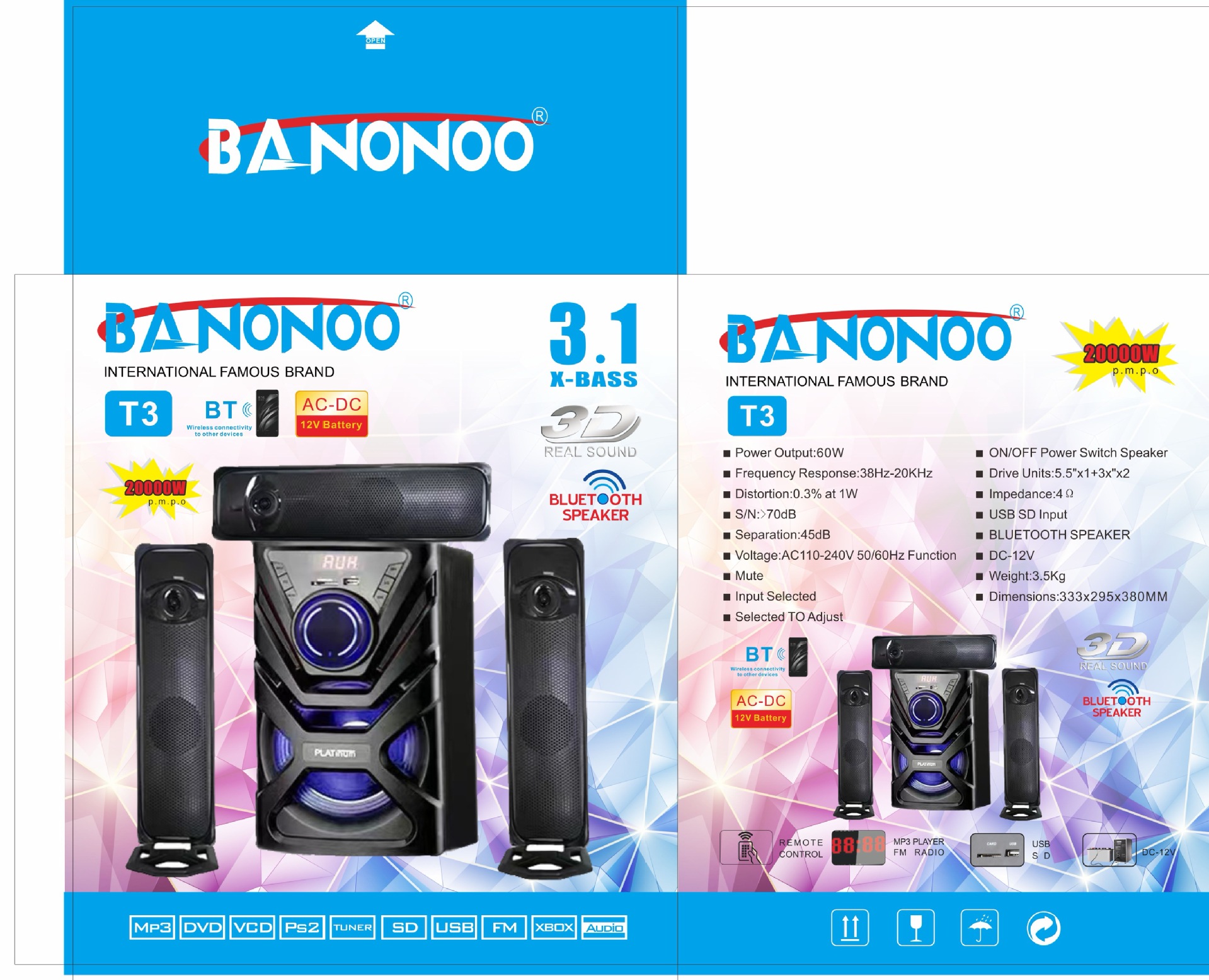 功能:蓝牙,TF,USB,AUX,FM,遥控旋钮带灯