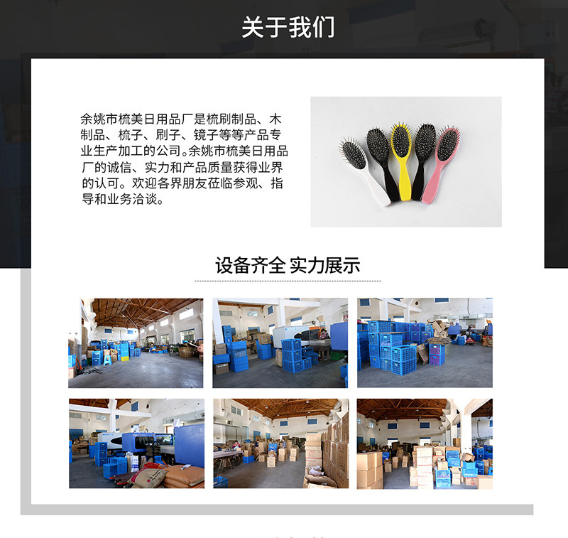 Yuyao Shumei Daily Goods Factory is a professional manufacturer and processor of comb and brush products, wood products, combs, brushes, mirrors, and more. The company's integrity, strength, and product quality have gained recognition in the industry. We welcome friends from all walks of life to visit, guide, and conduct business negotiations.