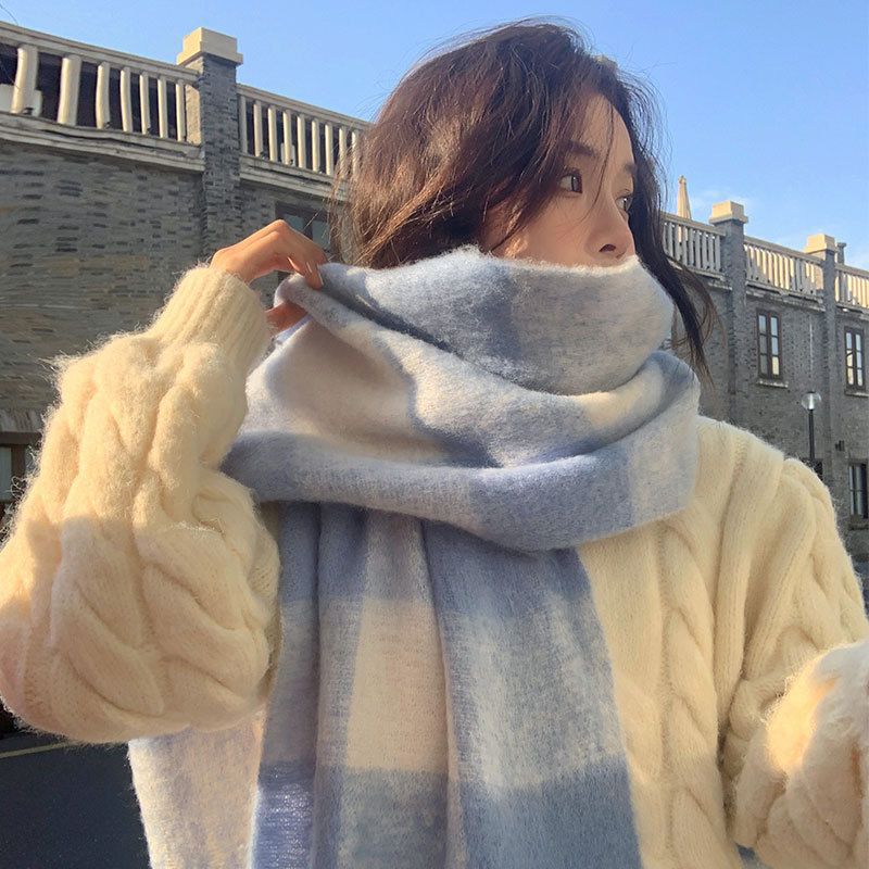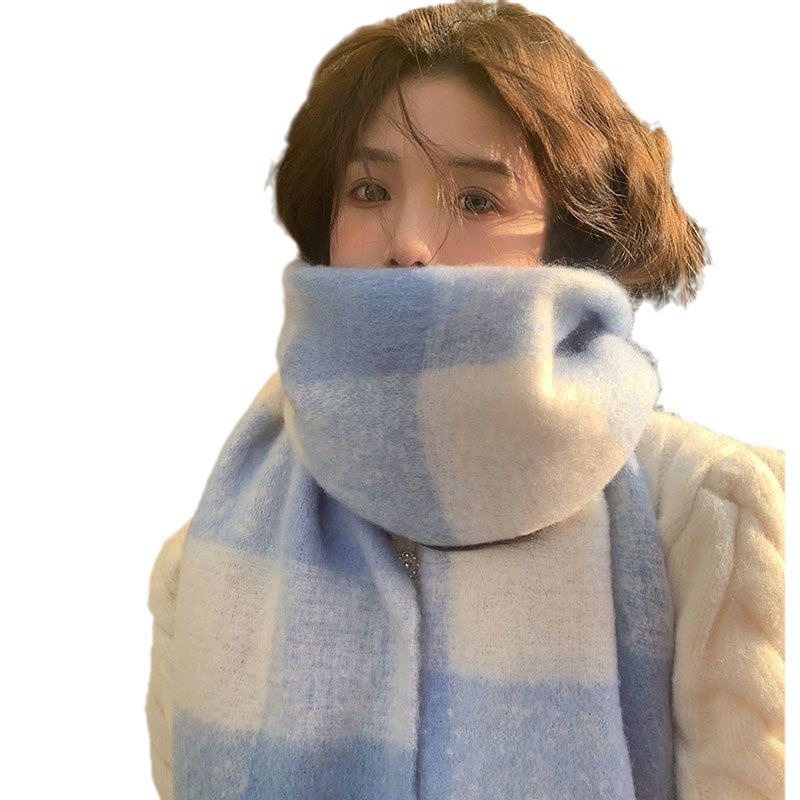 celebrity style cream blue plaid mohair scarf women's christmas gift all-match plaid scarf men's universal fashion