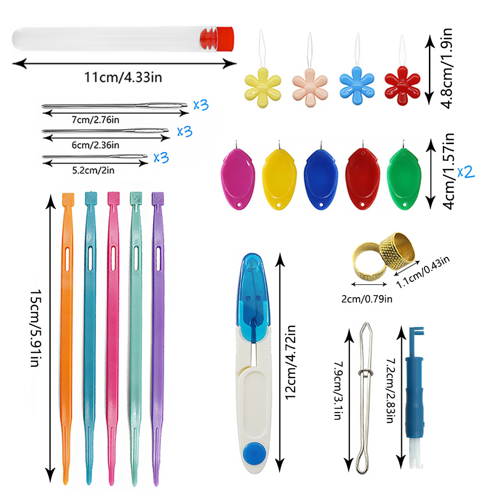 [Specification] 5 knitting needle threading devices +1 blue sewing machine needles needle-threader +1 band threading device +9 big eyes sweater needle +1 syringe +4 flowers needle-threader +10 thumb needle-threader +2 Thimble +1 scissors +1 storage box