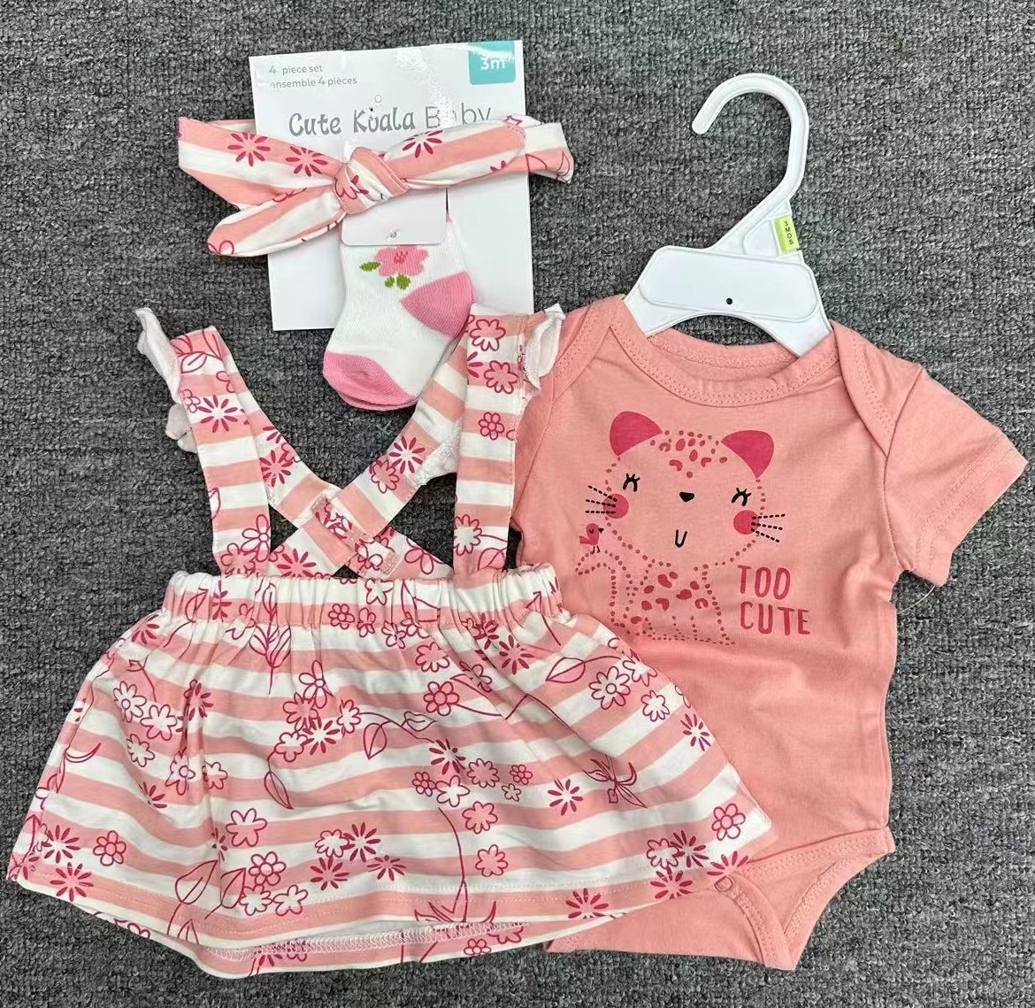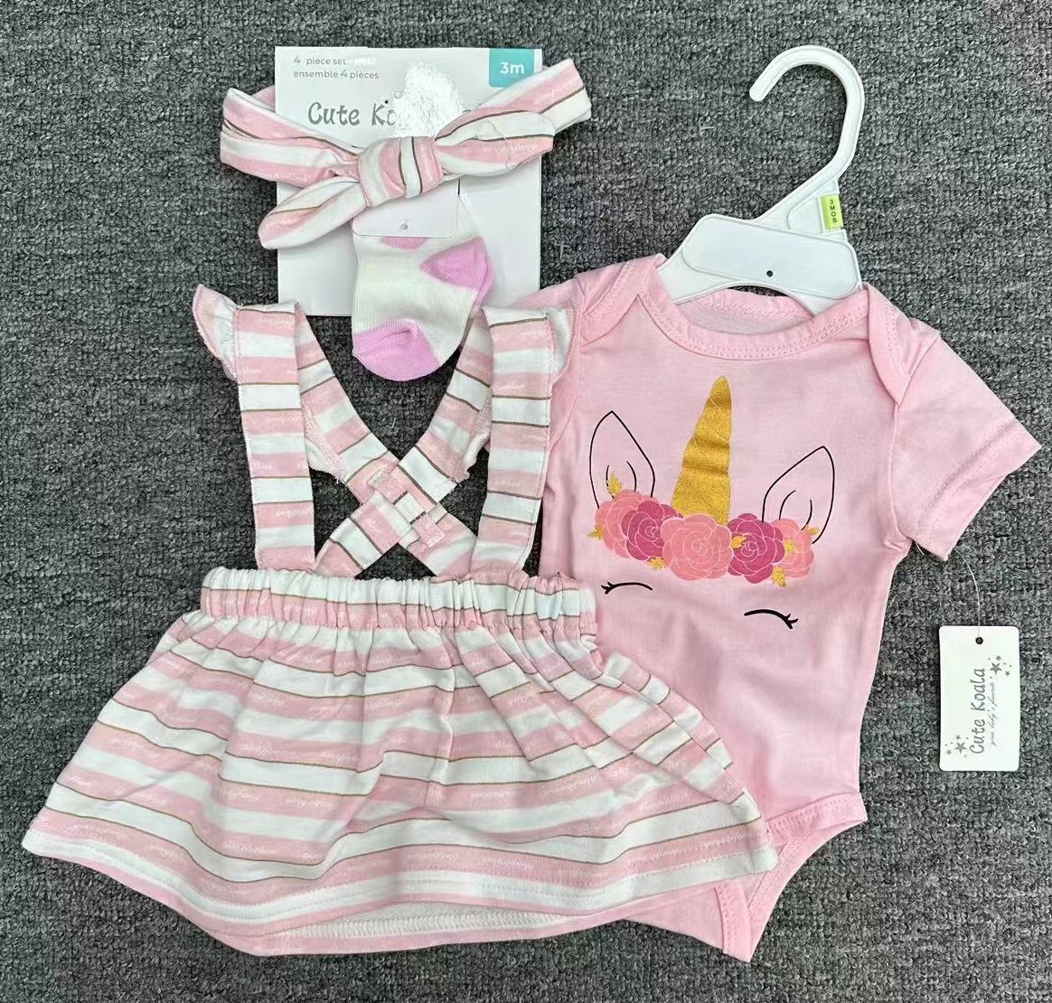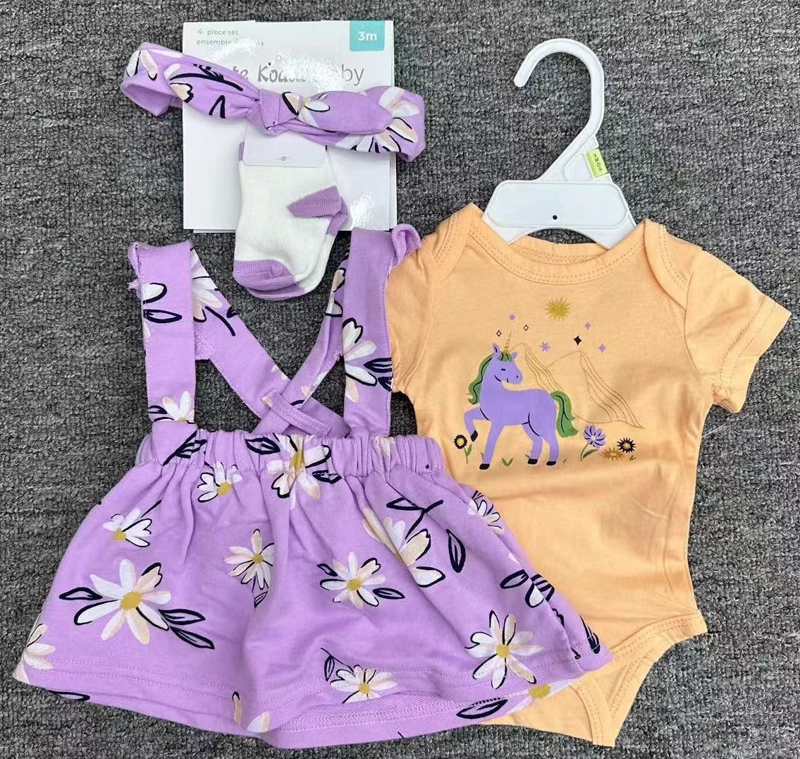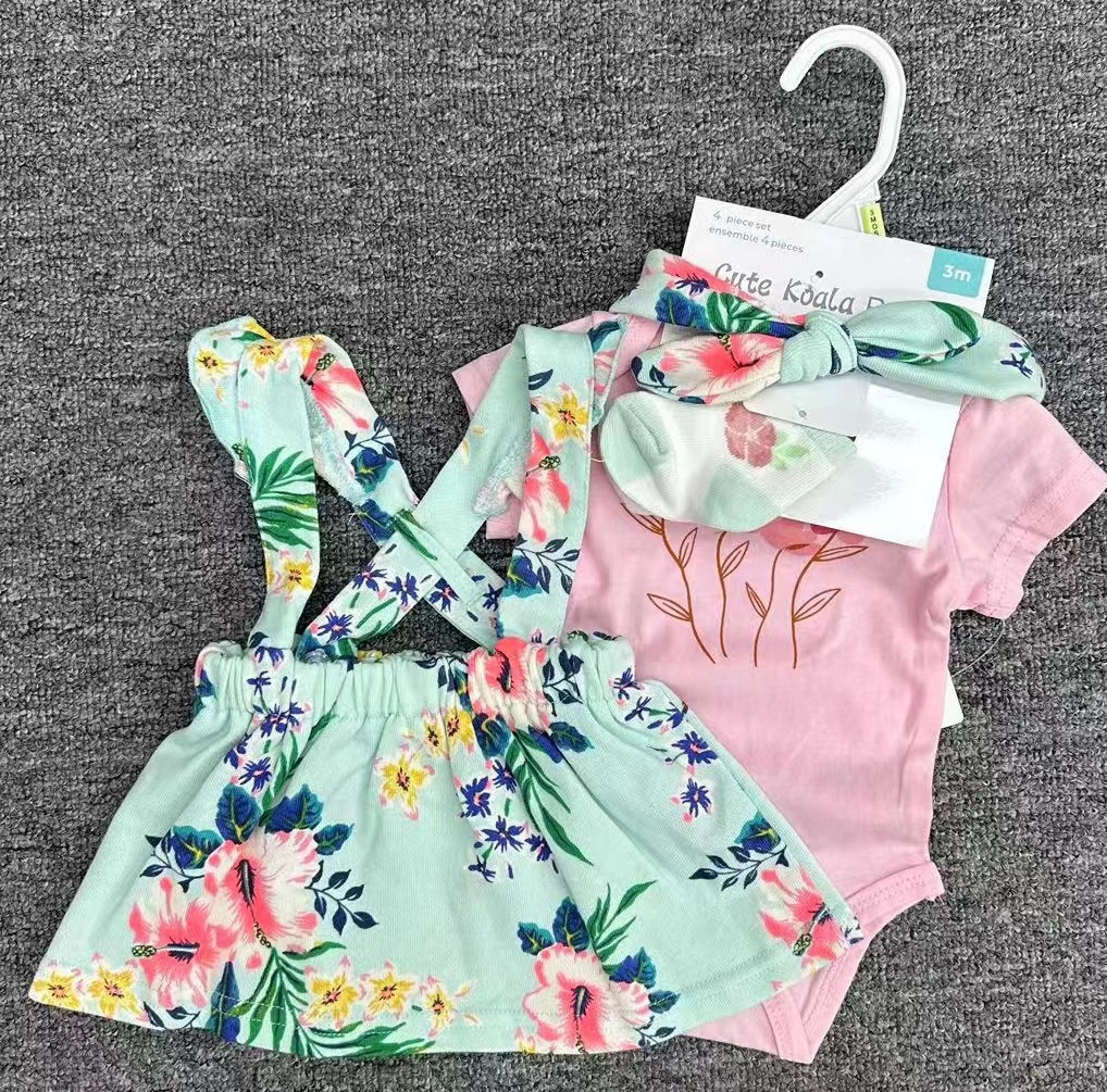 Short-sleeved baby clothes + overalls + socks + hair band