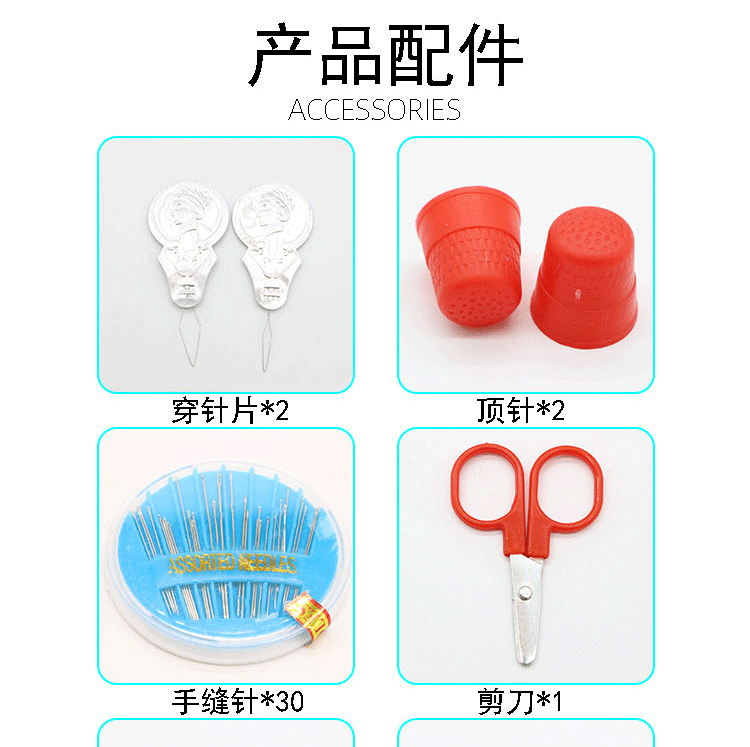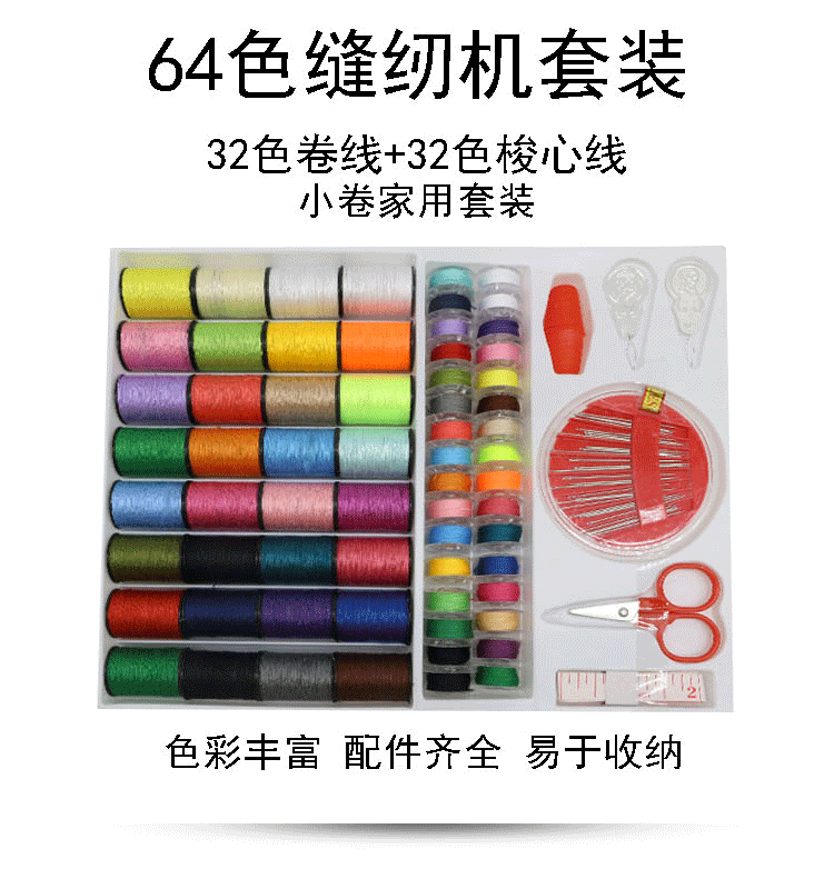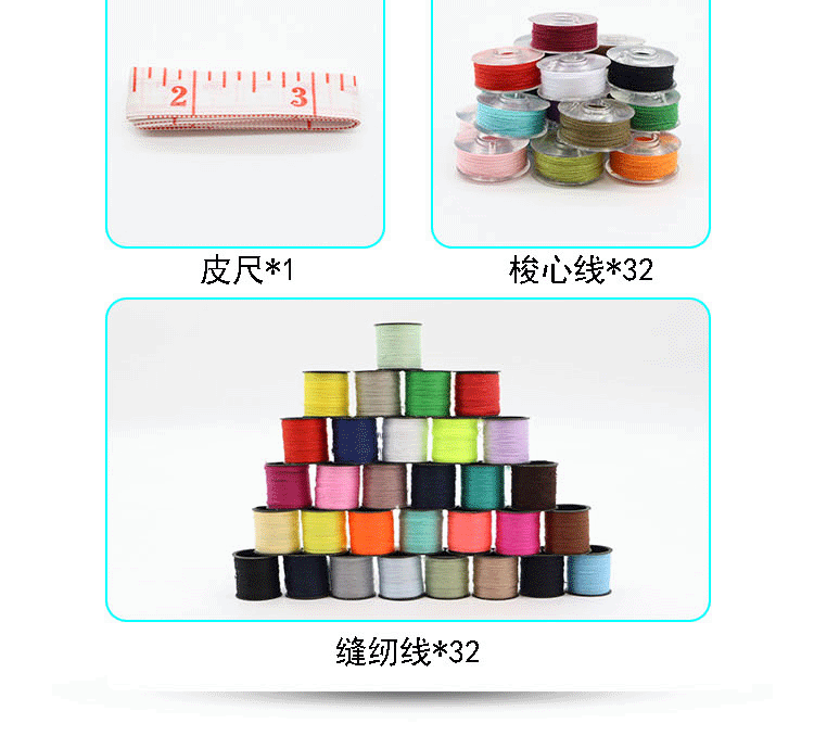 [Specification] 32 rolls of sewing thread +32 rolls of bobbin thread +1 tape measure +1 scissors +1 plate of 30 needle cards +2 threading pieces +2 Thimble