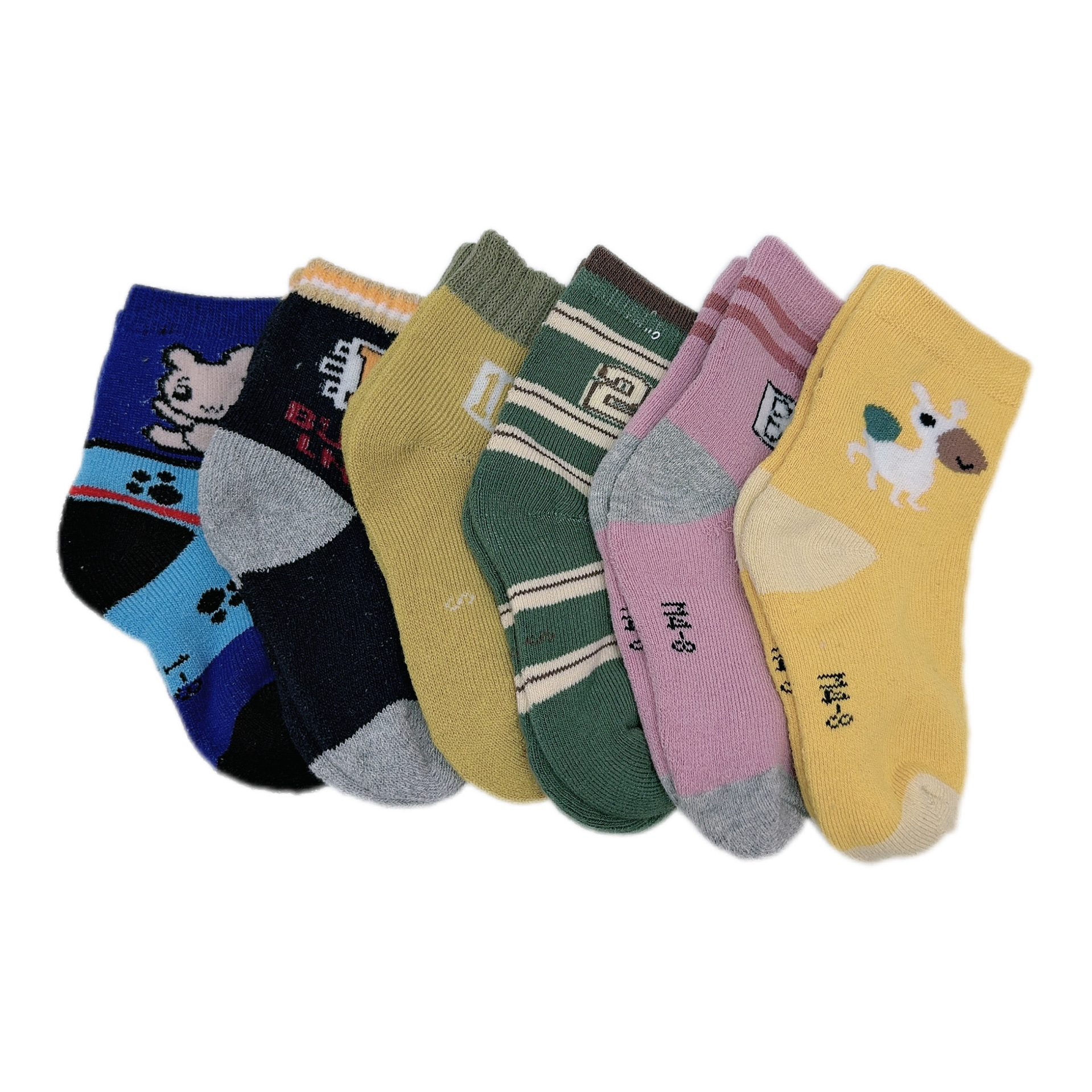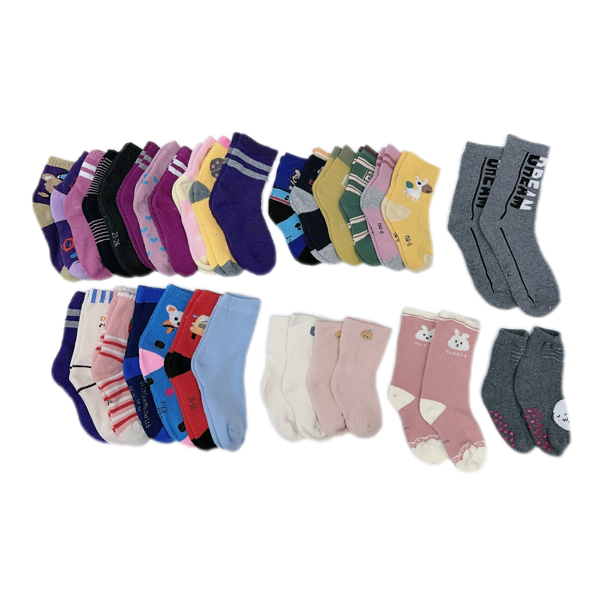 Assorted children's socks with a rough surface, available in large, medium, and small sizes. New stock of 5,000 pairs. TerrySocks mix by random, 5,000 pieces in stock, 3 sizes.