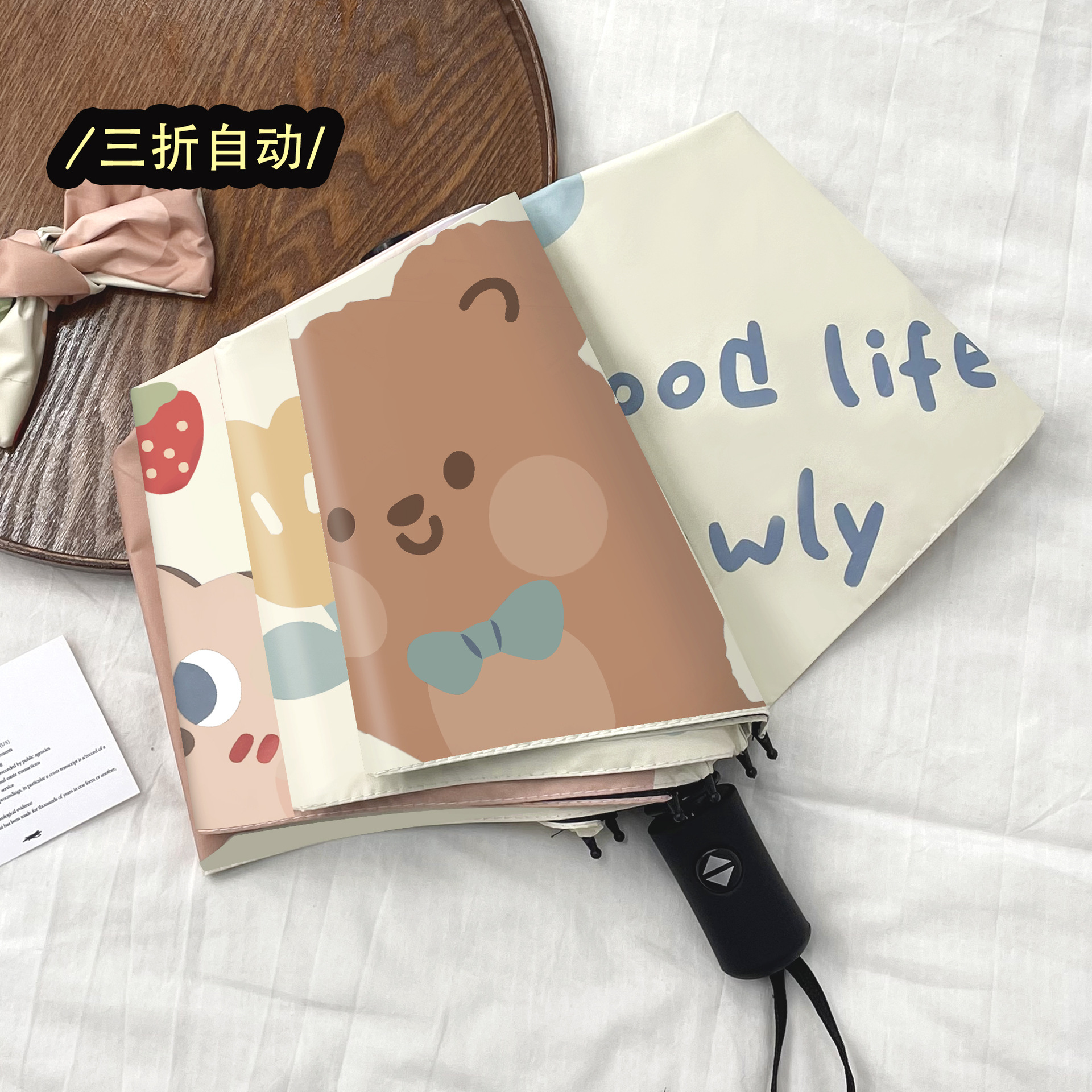 khaki cartoon bear. self-opening umbrella