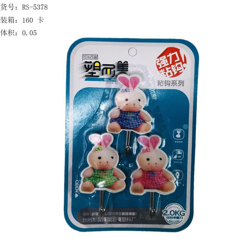 ITEM NO.【Product Model Number】: RS-5369 NAME【Product Name】: Cartoon Strong Hooks (3-pack) QTY【Quantity】:160 cards "CBM【纸箱体积】:0.06 Material【Product Material】: PS+Metal+Adhesive Color: White Weight【Product Weight】:43 grams per card Packaging【包装方式】:3个一吸卡" "Packaging【包装方式】:3个一吸卡 "W.G【Gross Weight of the Full Container】:8kilogram N.G【Gross Weight of the Whole Case】: 7 kilograms SIZE【Product Size】: Length 18.5* Width 12.5 cm / Cardboard Size Product Size: Length 7.0 cm * Width 4.2 cm